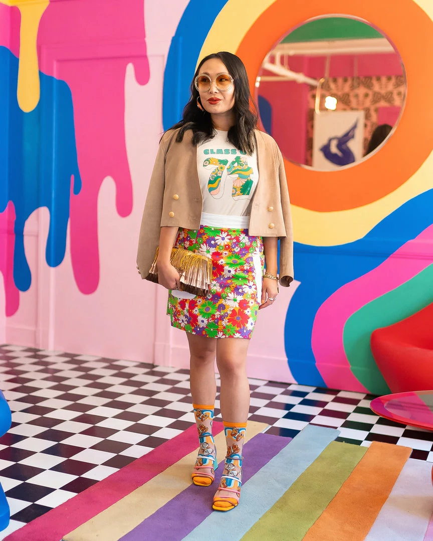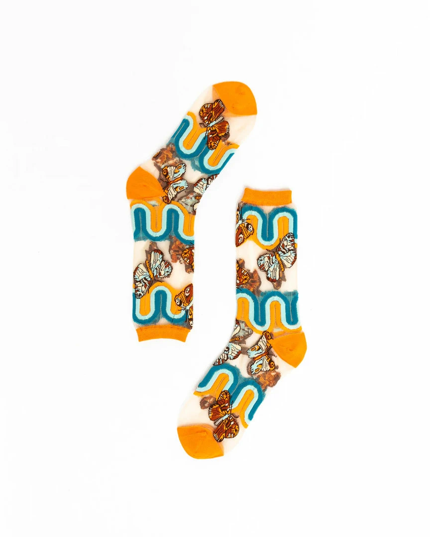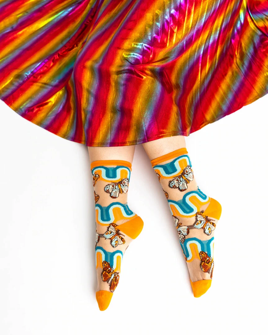 Our one year anniversary sock is inspired by the ’70s and features oh-so-groovy rainbows mixed with whimsical butterflies, paying homage to our first ever Sock Candy design the Polka Dot Ruffle Butterfly sock! Set against a nude sheer fabric, this statement sock adds color, texture, and a pop of vintage to your look.