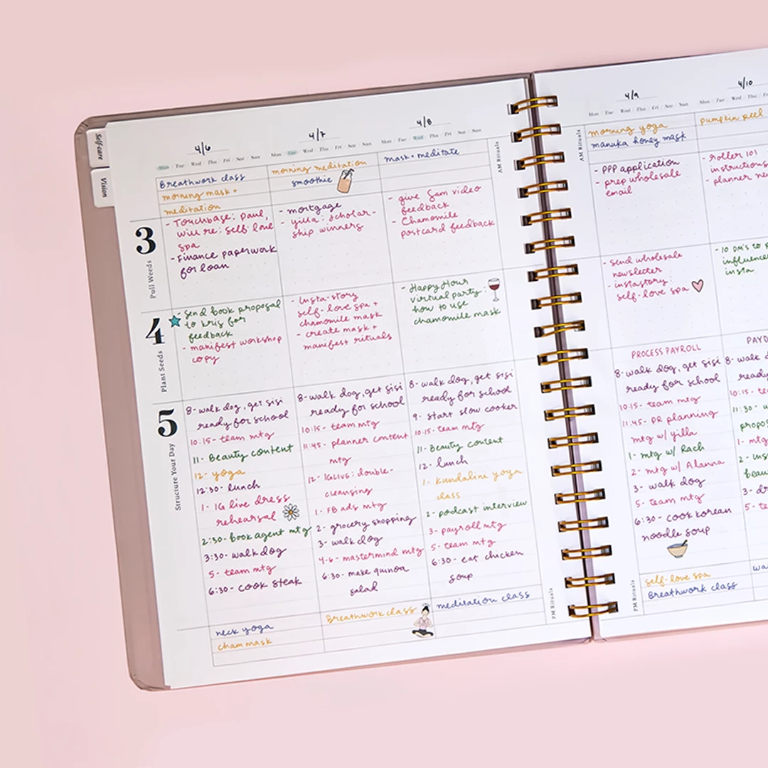 The first planner to focus on self-care every day. Studies show that self-care helps you function at your highest level, boosting happiness, balance, and success. For busy entrepreneurs, on-the-go moms, managers, professionals, and anyone who needs a system to “remember it all” for prioritizing the day. Our mission is to help you nourish to flourish, create daily rituals, and organize your “gorgeous chaos” so you can make time to savor the sweet parts of life.