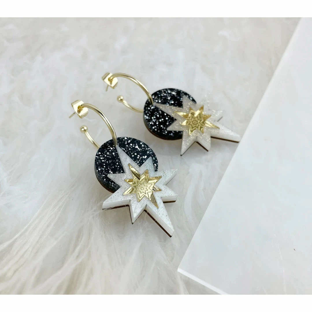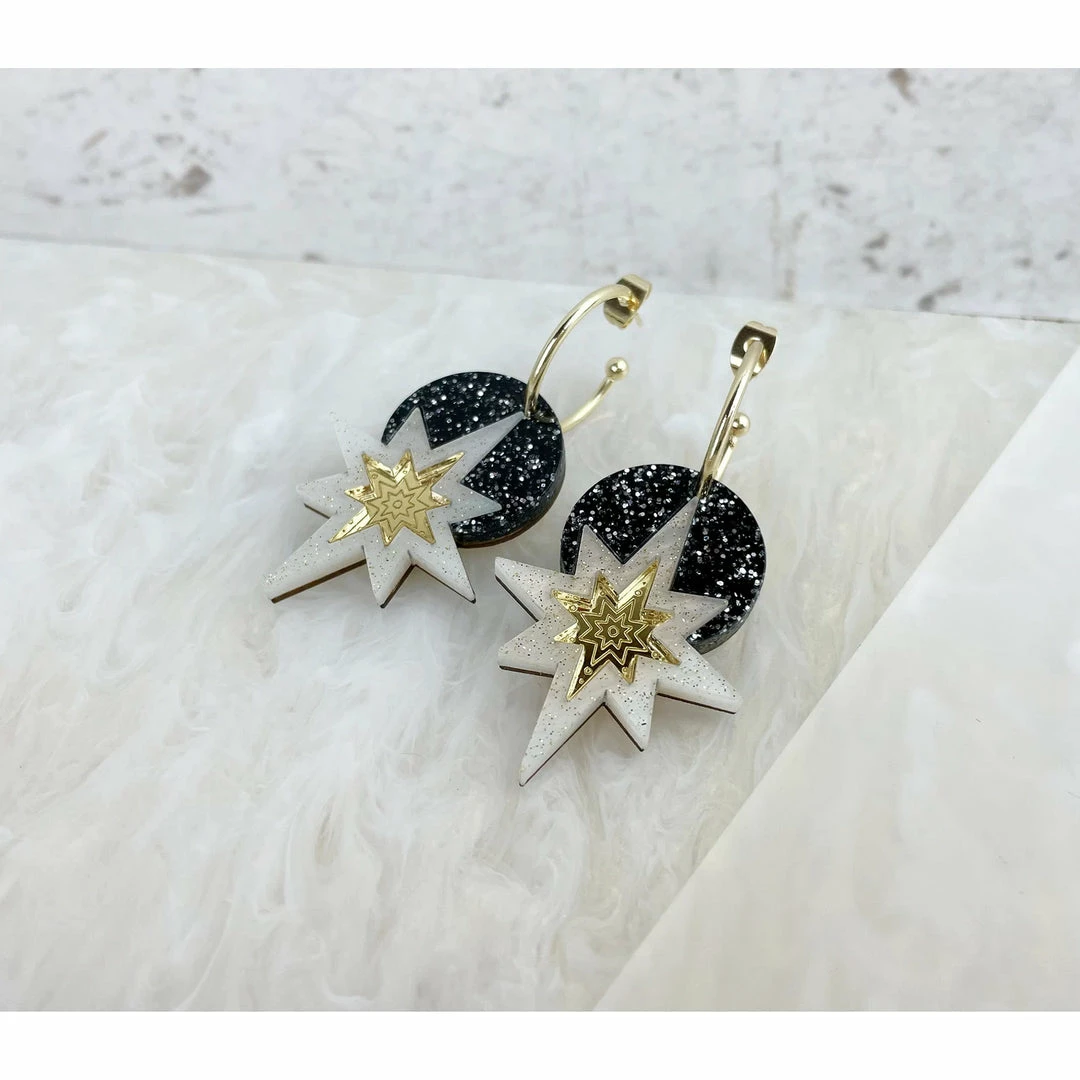 Glittered black/cream deco star hoop earring with gold mirrored centerπ