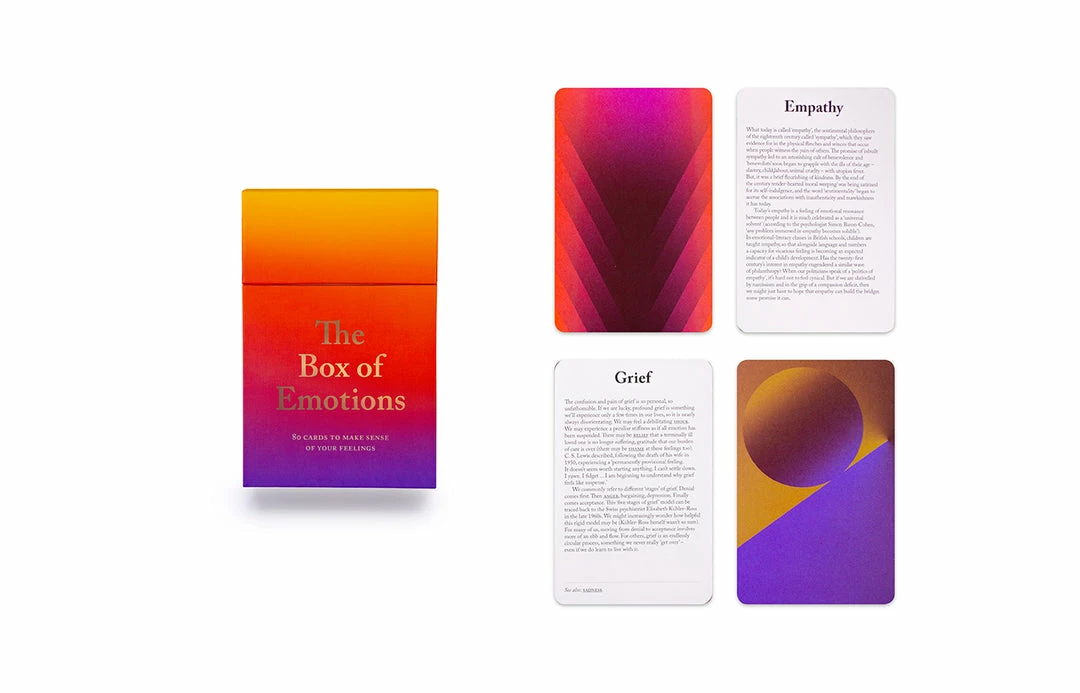 Each of the 80 cards contains a mini-essay on a different emotion on one side and a mesmerizing colour pattern on the other. Learn more about yourself and what makes your fellow beings tick, from anger and worry to empathy and courage. And with a host of less familiar emotions – dépaysement, fago, and litost among them – you may discover a whole new way of being.