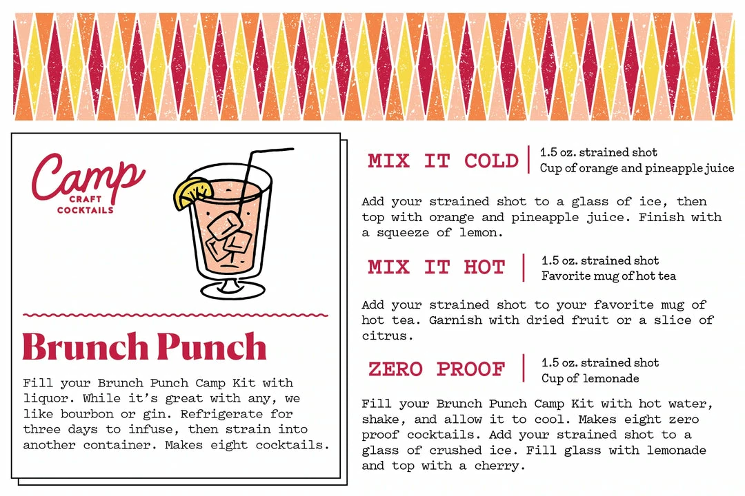 CAMP Craft Cocktails Kit includes: 1 Infusion ready jar. Alcohol not included. Serves 8, can be infused twice for a total of 16 servings.