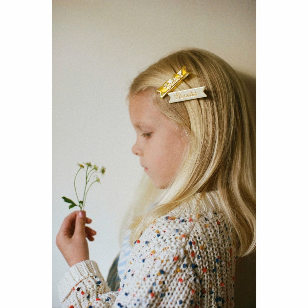 Each set of Butter Noodles hair clips comes with two custom ribbon-edge, cellulose acetate, alligator clips.