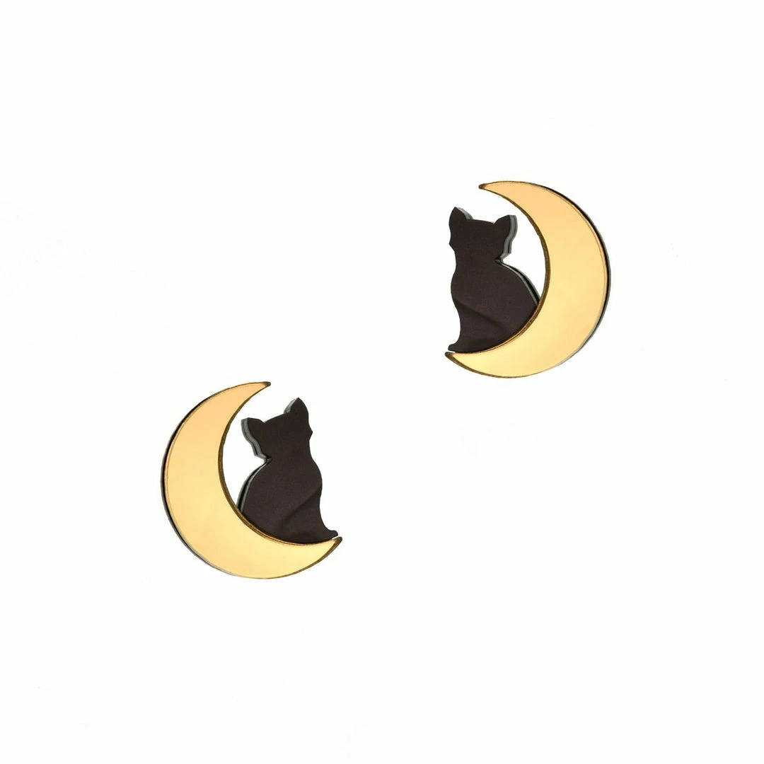 Cat in Moon earrings are our sleek and sophisticated take on Halloween. Cat in Moon earrings are cut from mirror gold acrylic and pearl black plastic. Cat in Moon earrings are sold as a pair. Cat in Moon earrings are approximately 1.26″ x 1.5″. A super special message is etched on the back of each earring!
