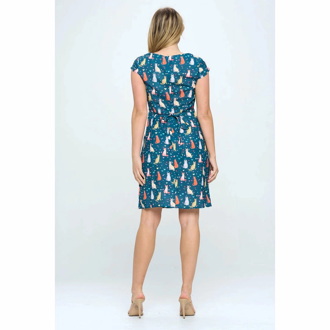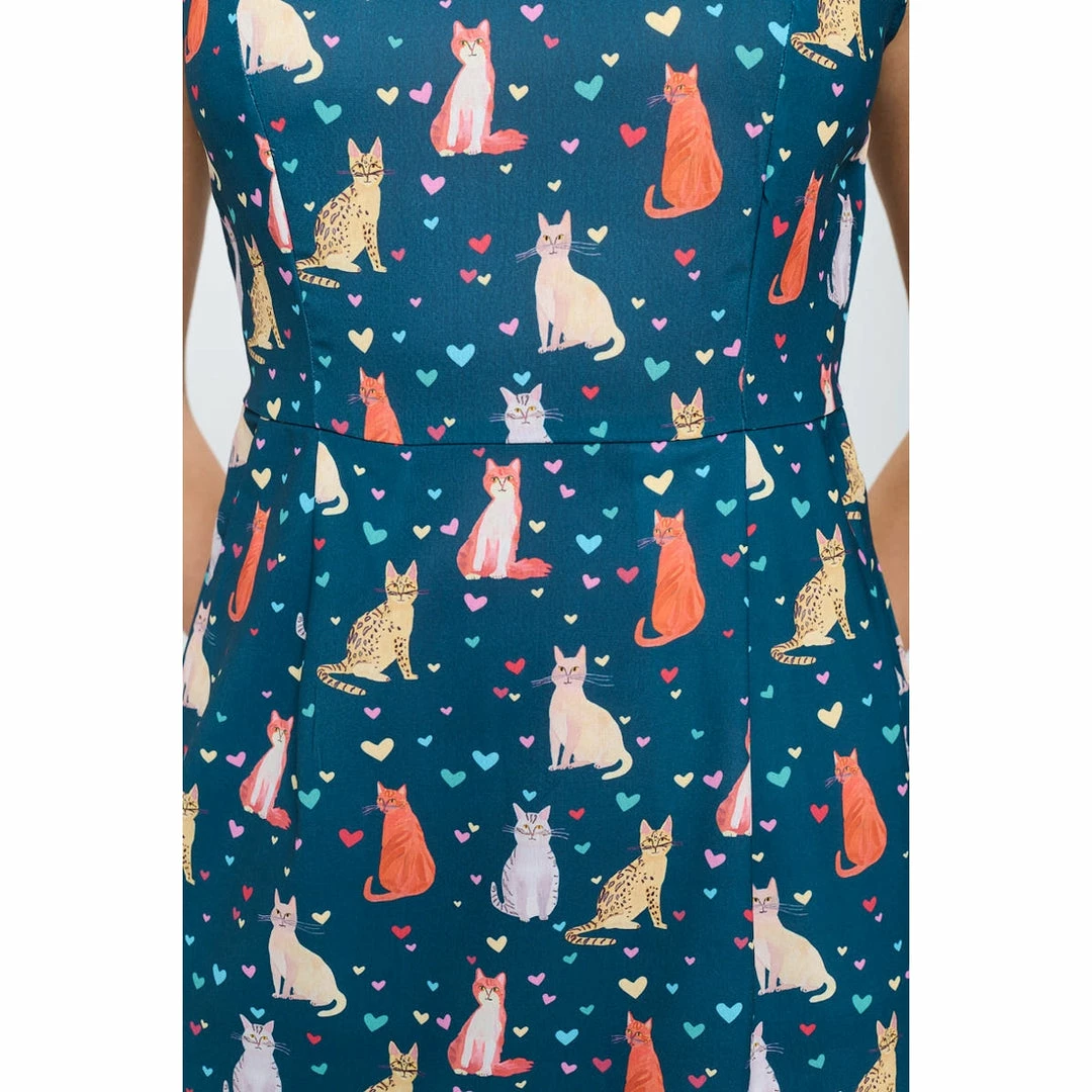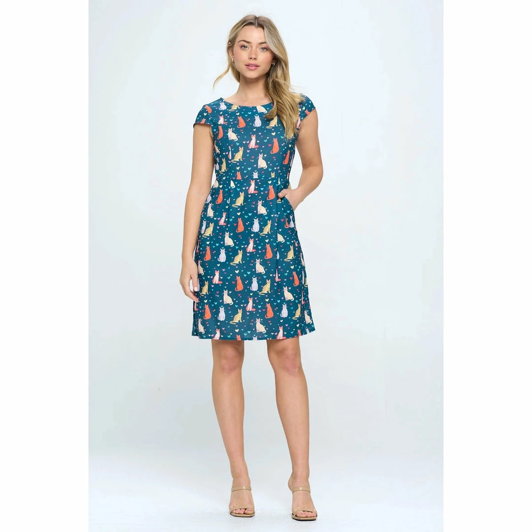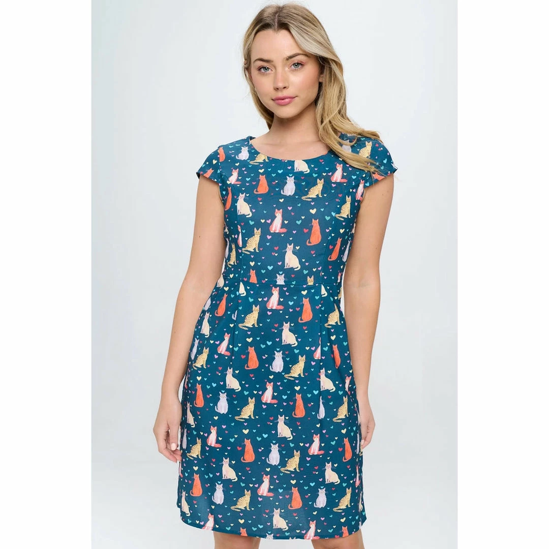 Kitties and hearts adorn this cute cap sleeve dress! It’s even got pockets to store catnip!