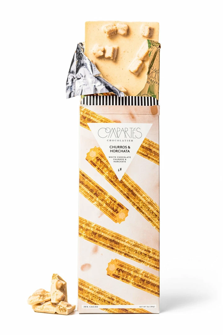 An amazing traditional combo of Churro pieces and sweet rice milk Horchata! Made in Los Angeles by Compartés Chocolates.