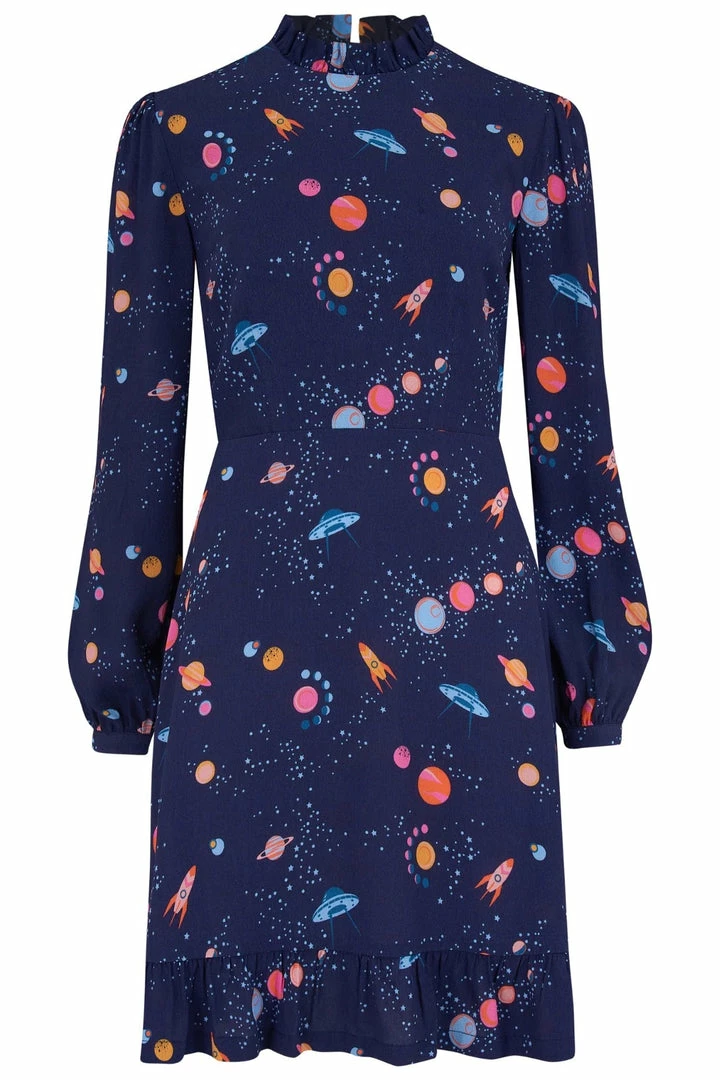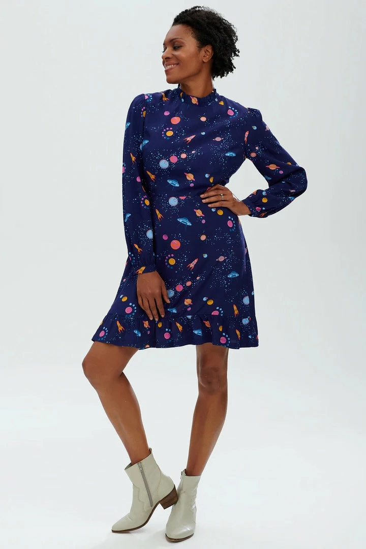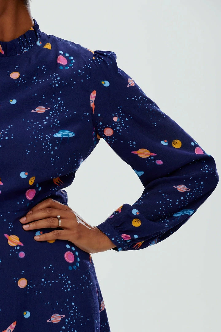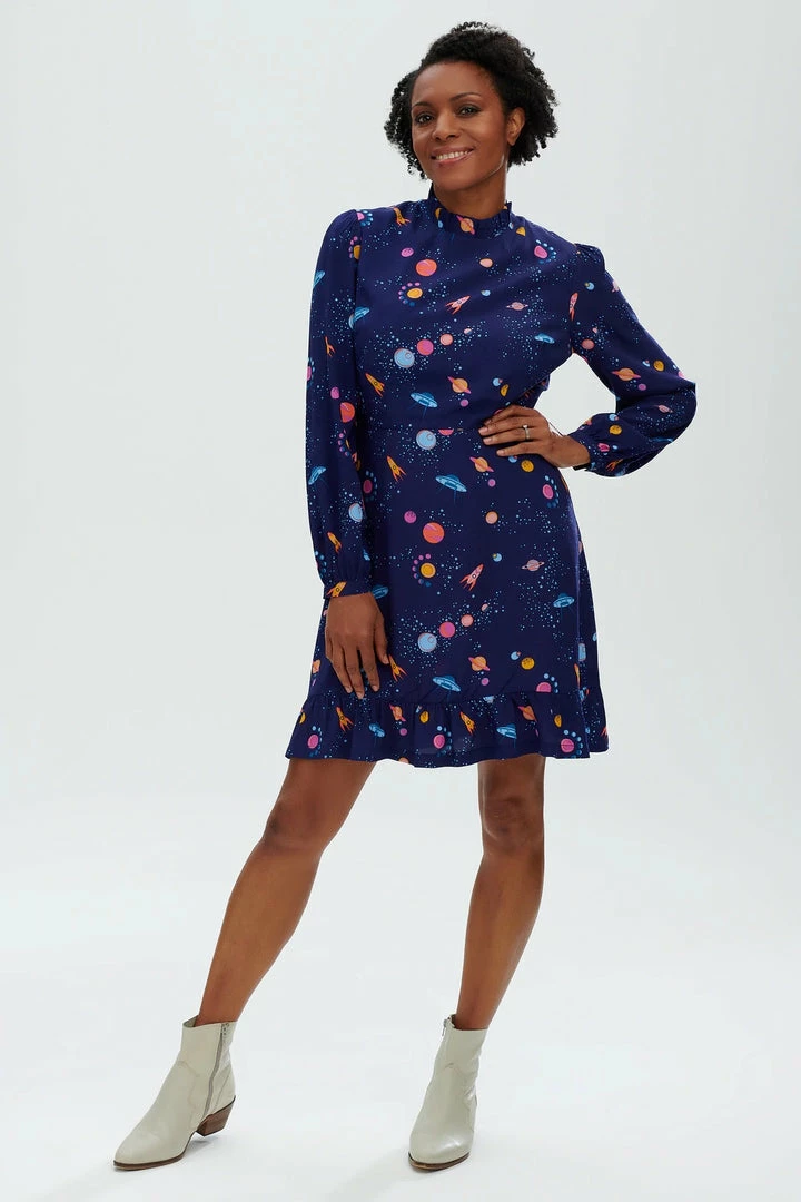 Smart yet playful, the new Cassia Dress shape features gathers at the shoulders, full length sleeves and a fitted waist for a flattering shape. This dress showcases our UFO space print fabric, hand-drawn by designer Olivia. To finish the look, the Cassia ruffled trims at the high neck, subtly tapered blouson sleeves and an above-the-knee length with a frill hem.