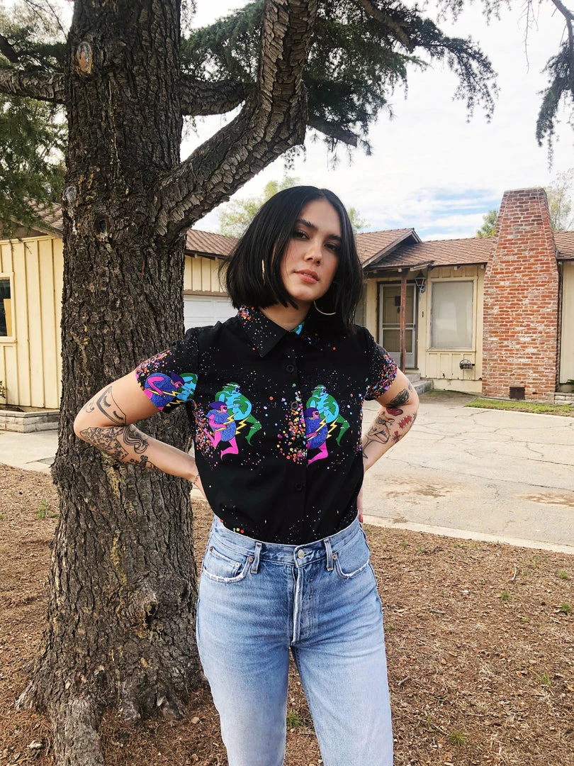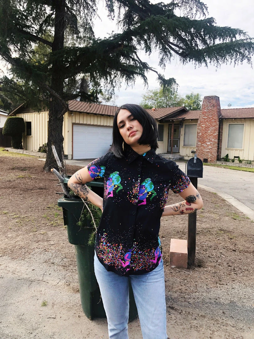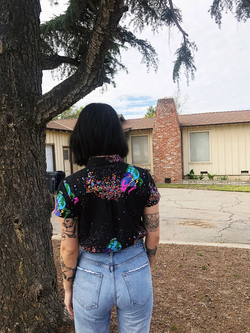 Care instructions: We want all our garments to last without harming the environment so only wash garments when they really do need it. This item is made of 100% rayon so we advise you dry clean only. We’ve experimented with hand washing on cold and hang drying but because every textile has a different ink/fabric combination the shrinkage is inconsistent and not worth the risk.