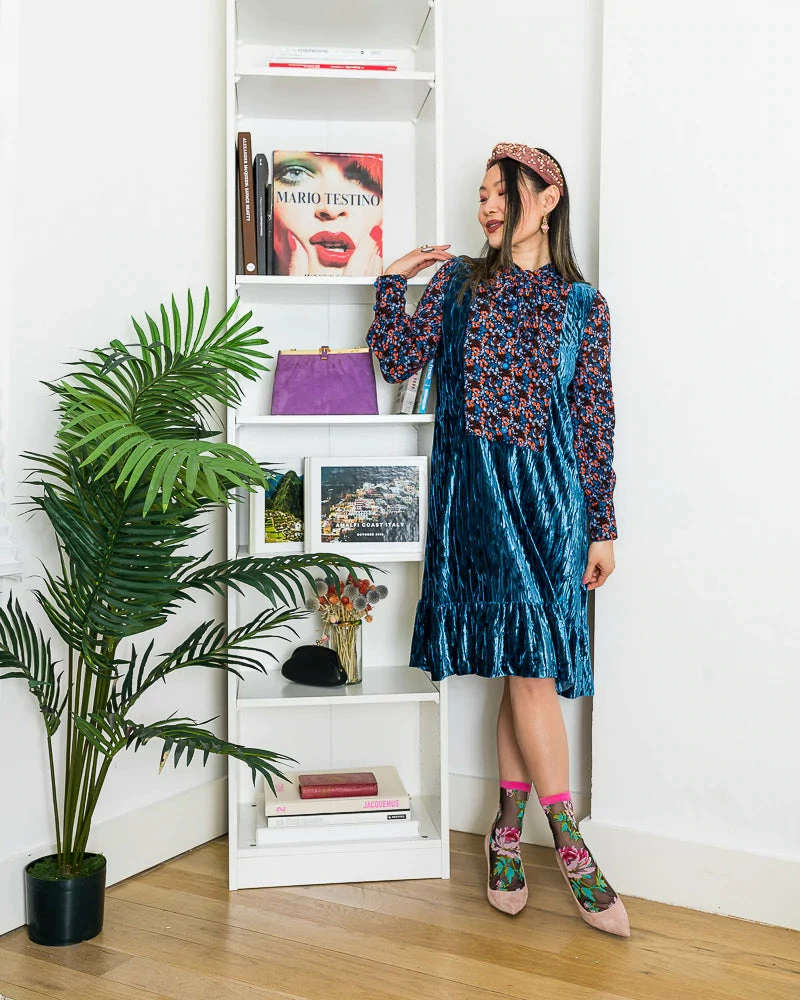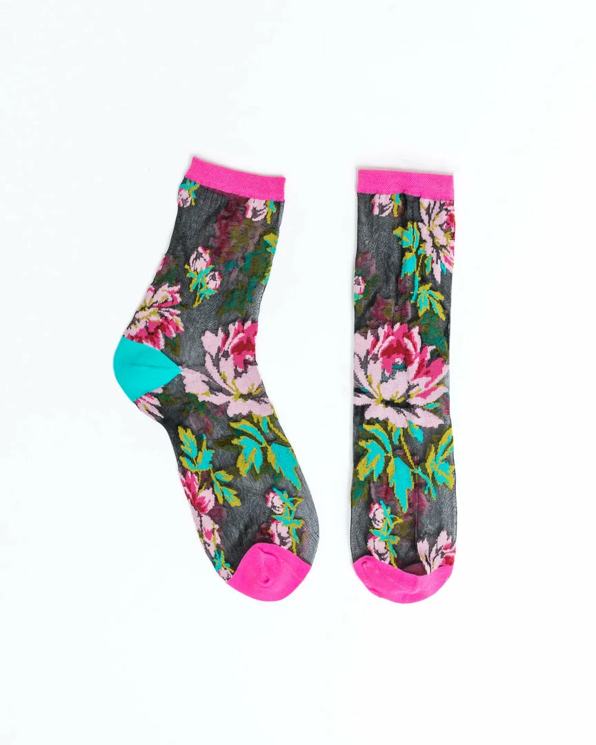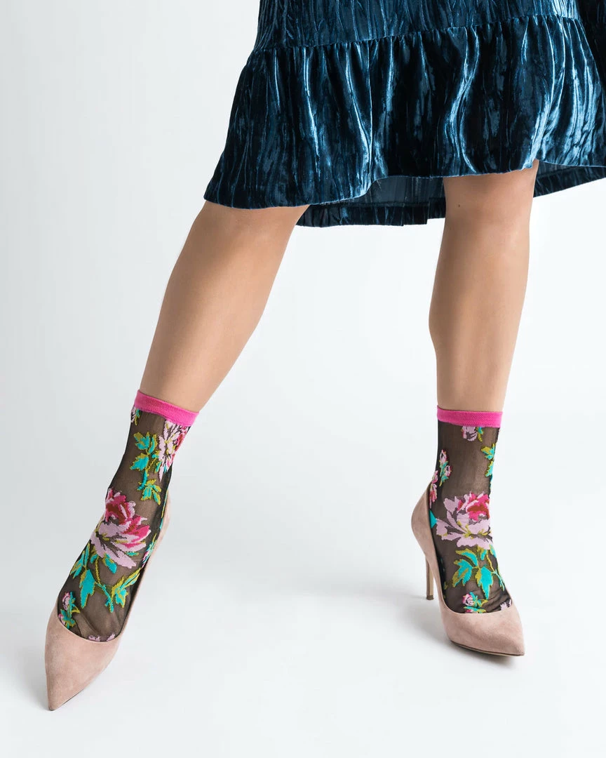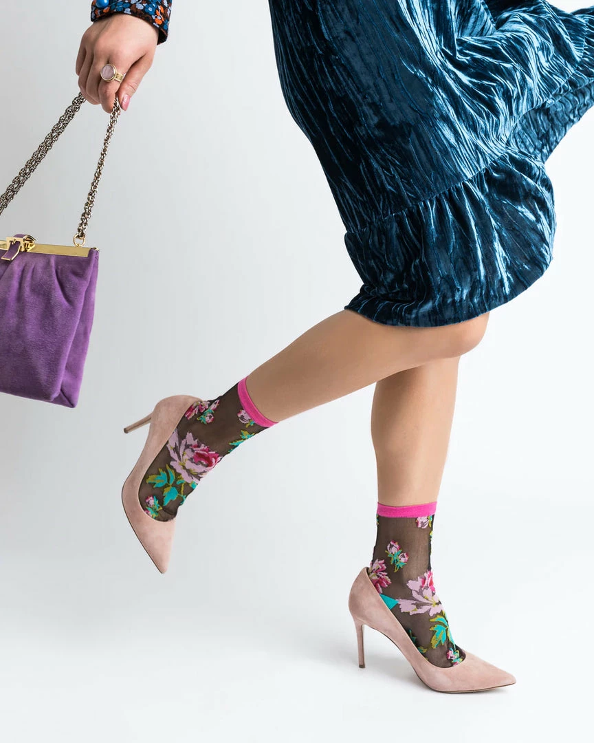 Transition seamlessly from Winter to Spring with romantic pink roses set against black sheer fabric for a charming English garden vibe. The contrasting turquoise heel and leaves add an unexpected pop of color.