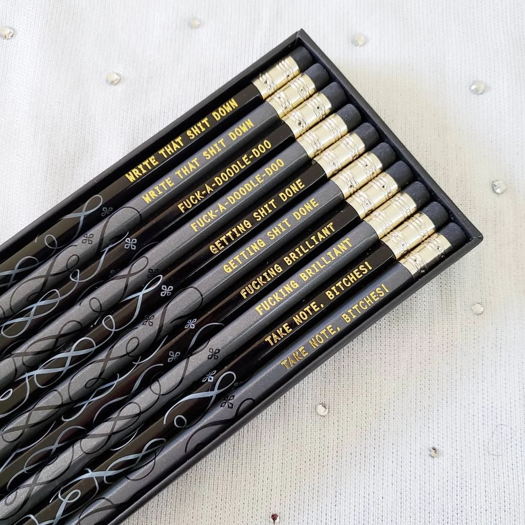 This fancy-ass set of ten graphite eraser-topped pencils features inspirational profanity, calligraphic flourishes, and foil stamping. A great way to add a touch of humor and irreverence to everyday writings.