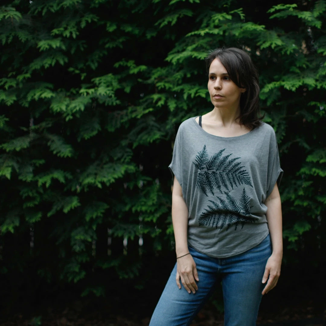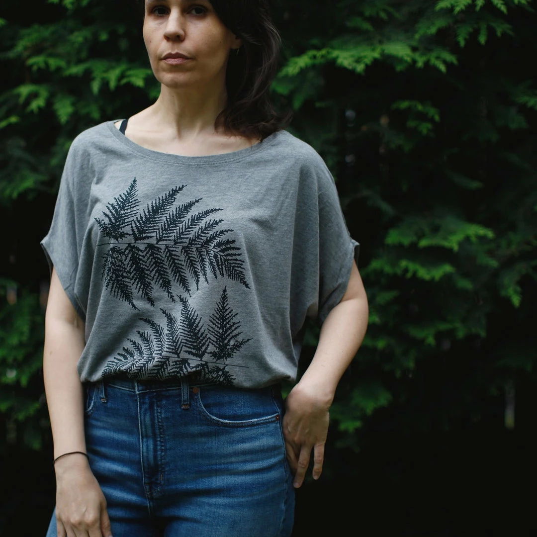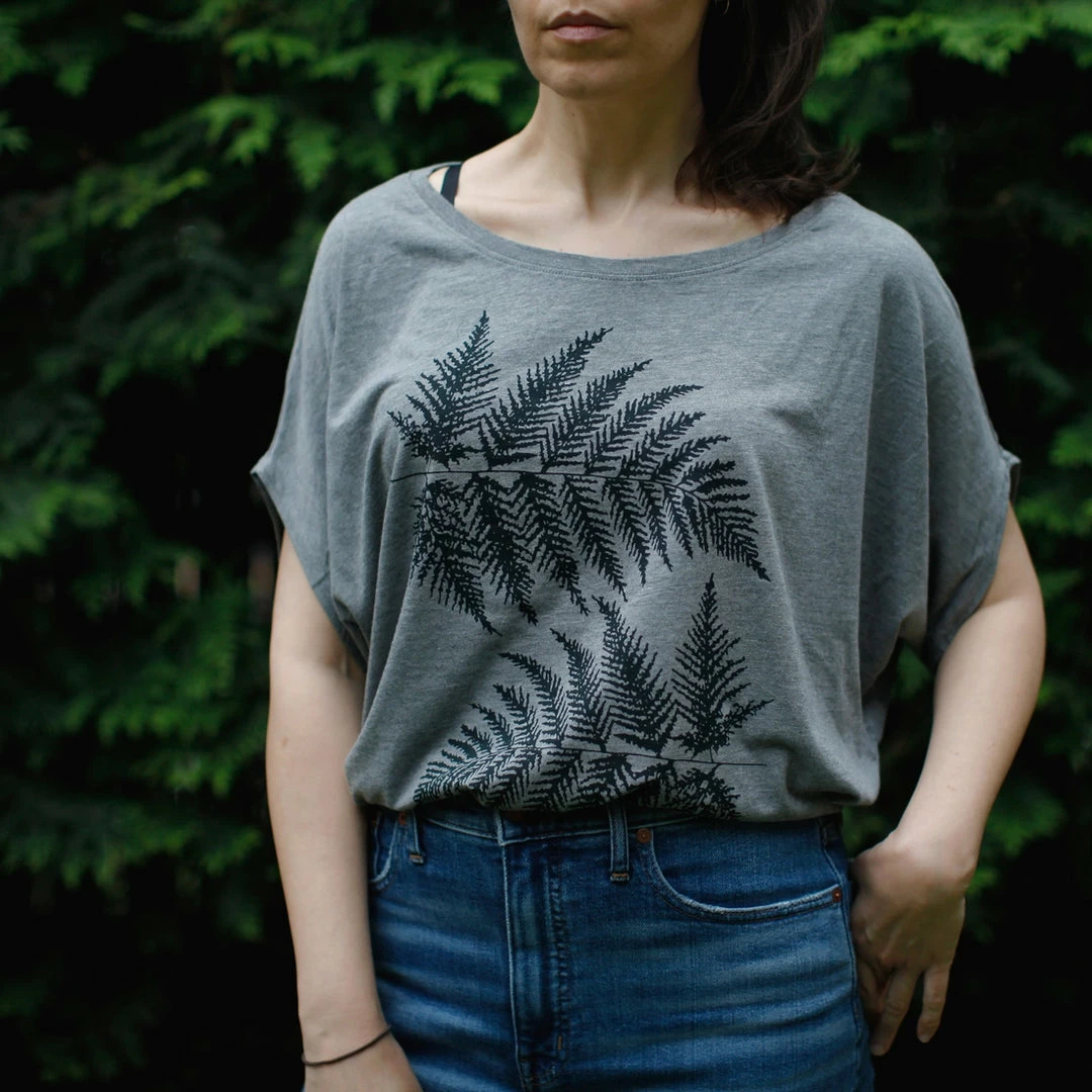 Off the shoulder organic bamboo top featuring forest fern leaves.