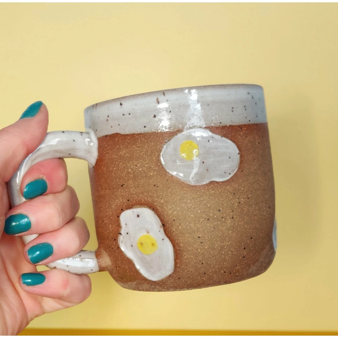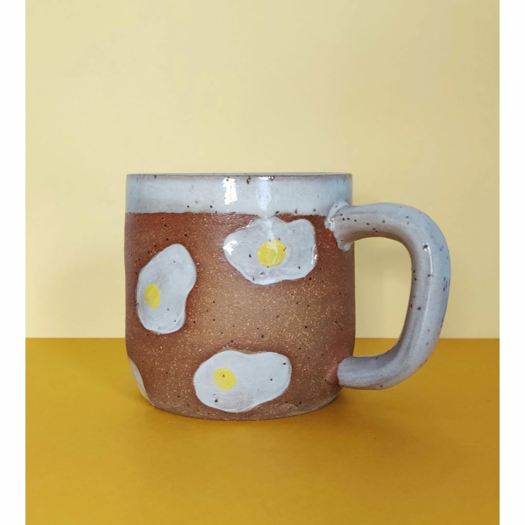 Stoneware mug, stamped and glazed with fried eggs all over the body of the mug. Inside glazed a glossy speckled white. 16 oz