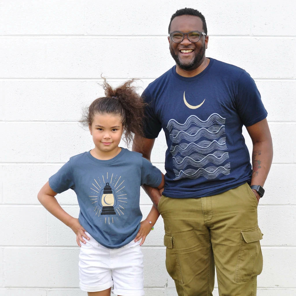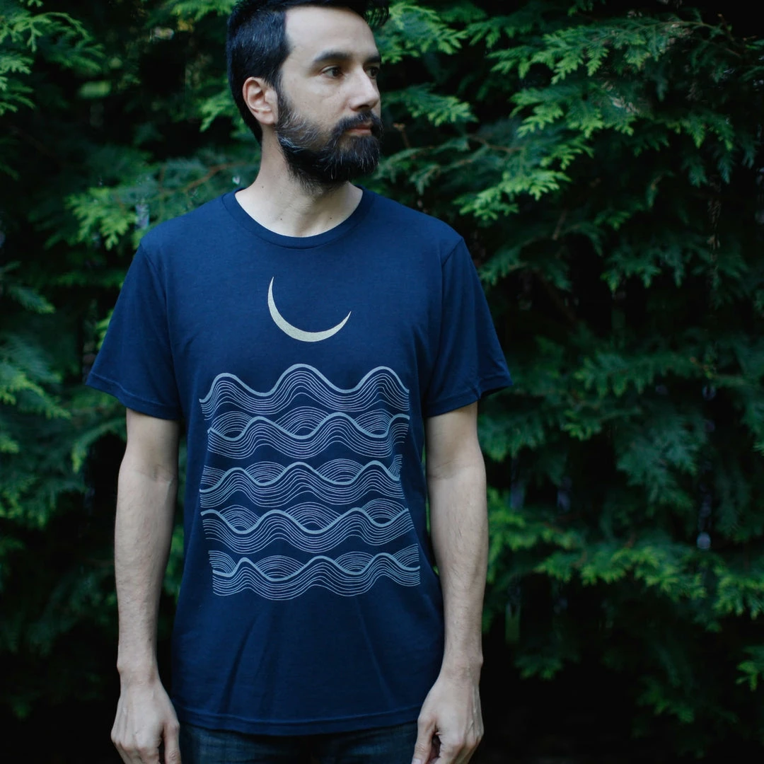 The Full Fathoms print features a stack of pale gray waves and a gold crescent moon hovering overhead. Printed on a mens / unisex tee. Navy blue with gold and pale gray ink. Available in sizes S-2XL.