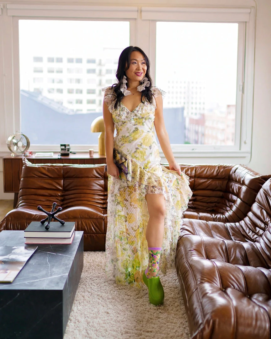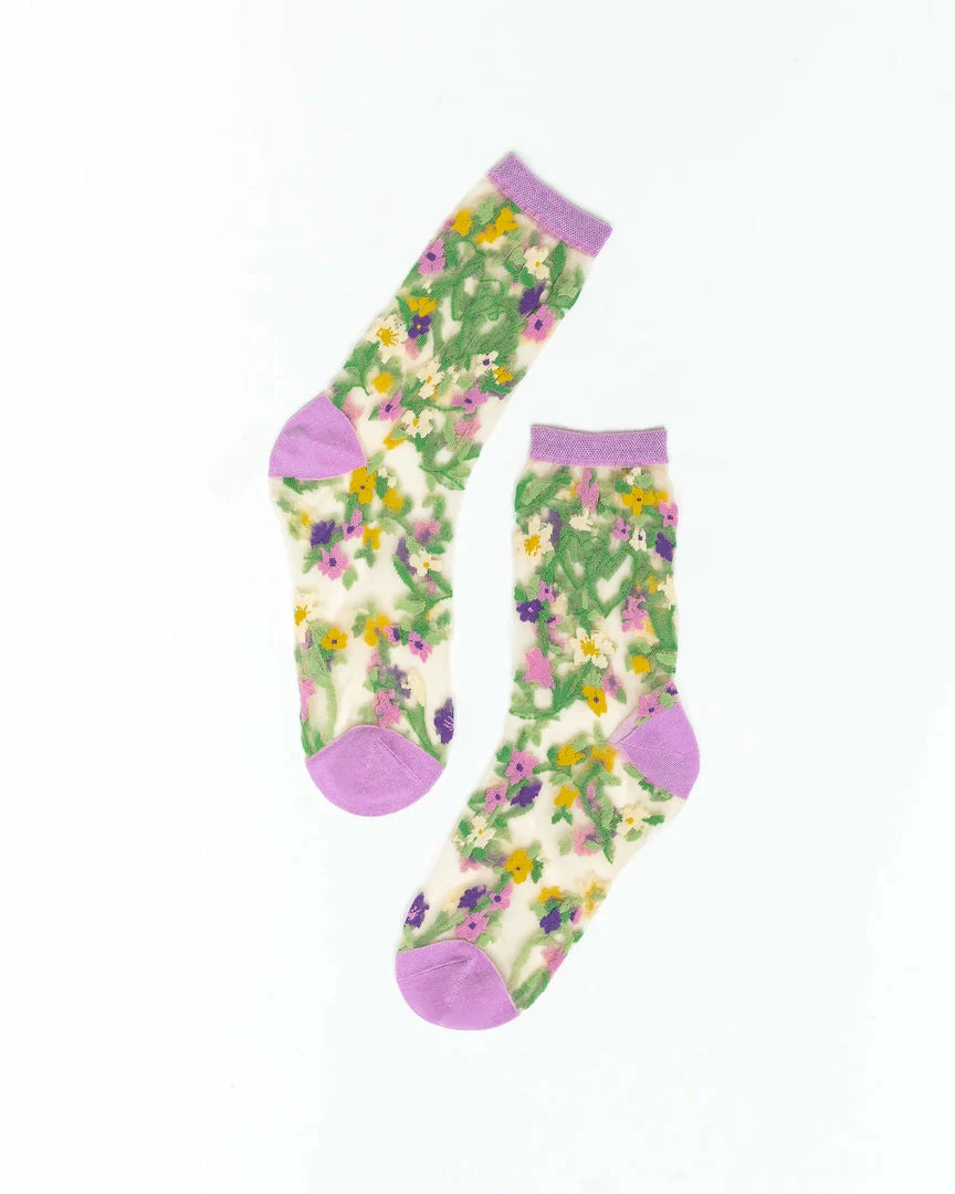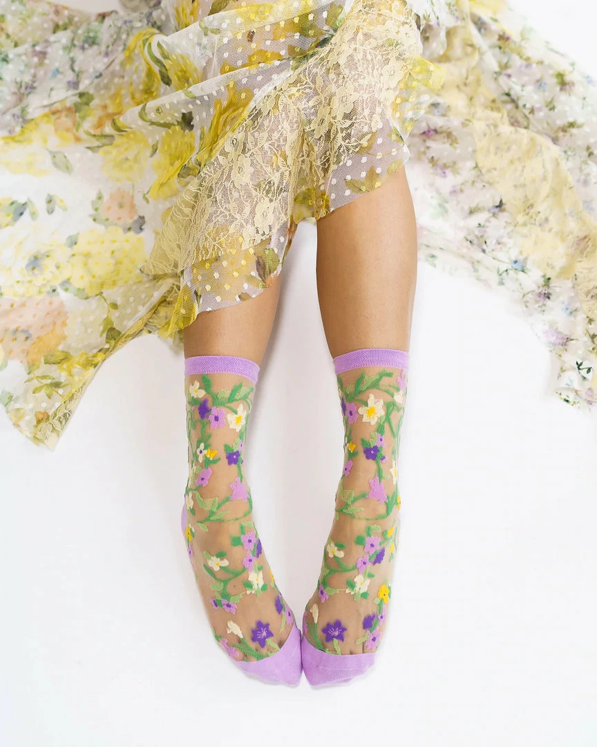 Inspired by the Sock Candy founder’s wedding colors, delicate lavender and yellow florals are set on green vines to form two intertwined hearts at the ankle. Perfect for pairing with floral dresses, add a soft romantic touch to your look for Spring. Finished with a lavender cuff and ankle for an extra feminine vibe.Â