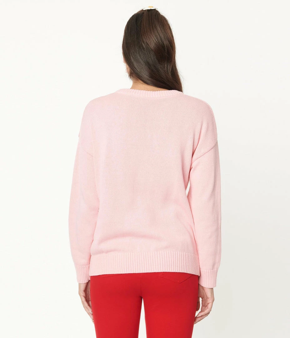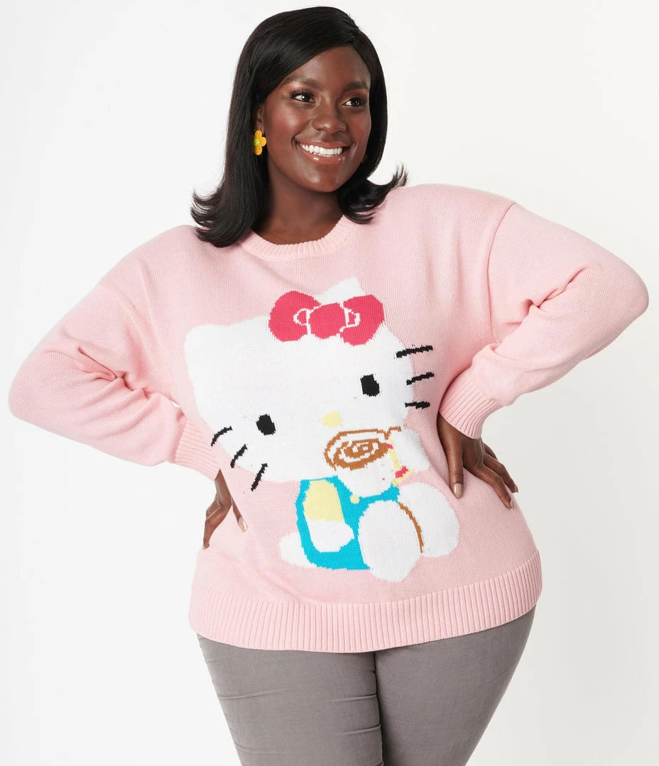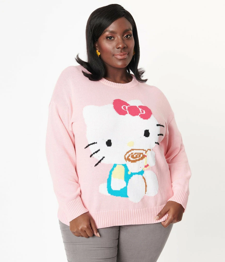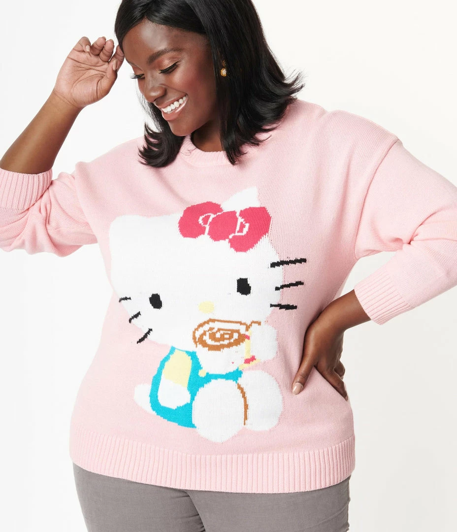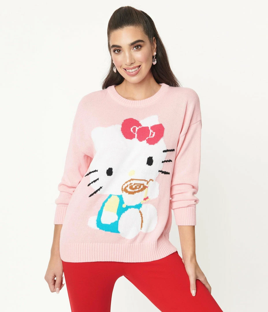 Good coffee, good morning! Start your day off cozy in this adorable sweater from Unique Vintage in collaboration with Hello Kitty. Crafted in a super soft pink knit stretch, and boasting the iconic Kitty herself enjoying a cup of her favorite hot beverage. Complete with crew neck, long sleeves, and a stay in place ribbed hem.