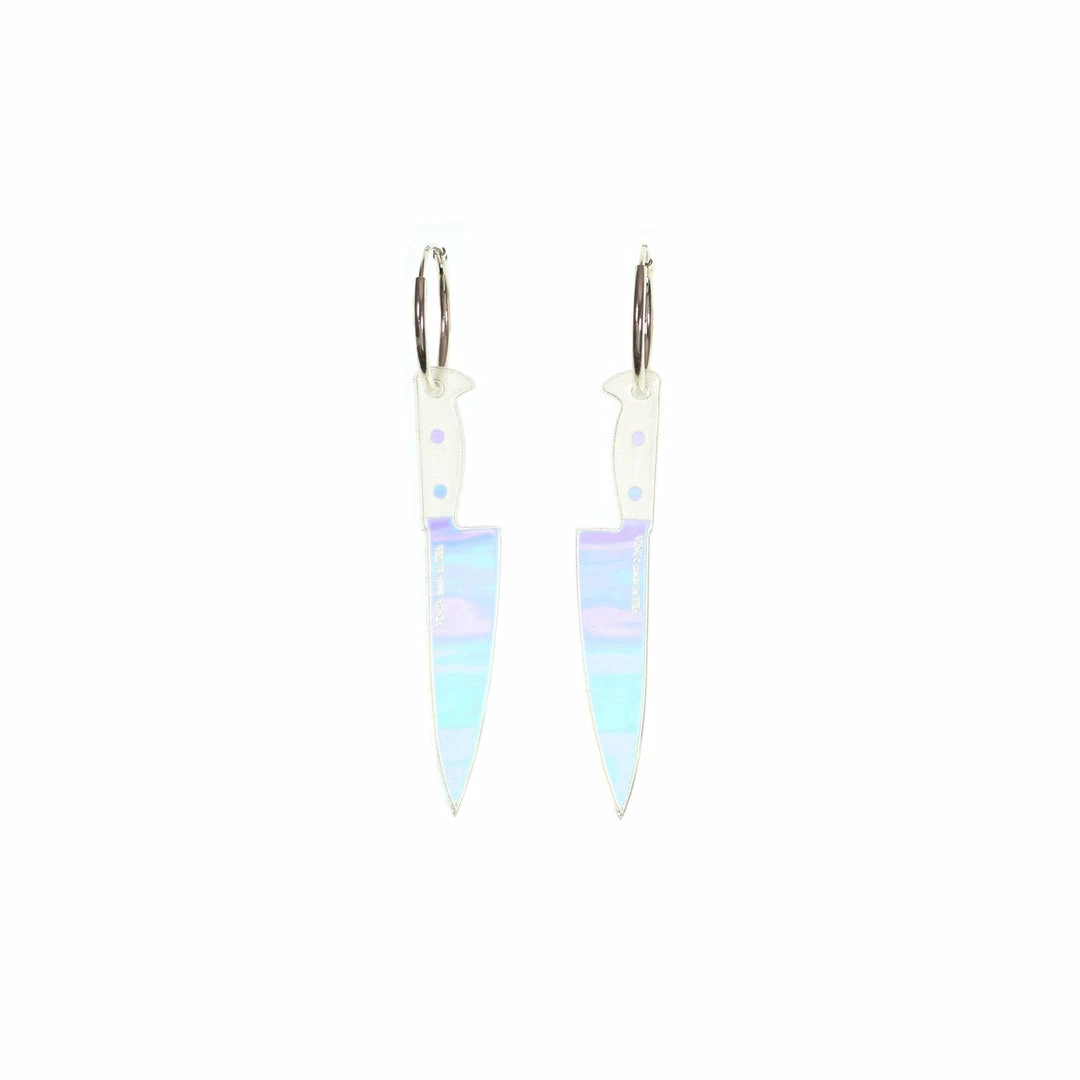 Hologram Knife Hoops are cut from holographic transparent iridescent acrylic. Two inch Hologram Knife charms are on a 1″ sterling silver hoop.