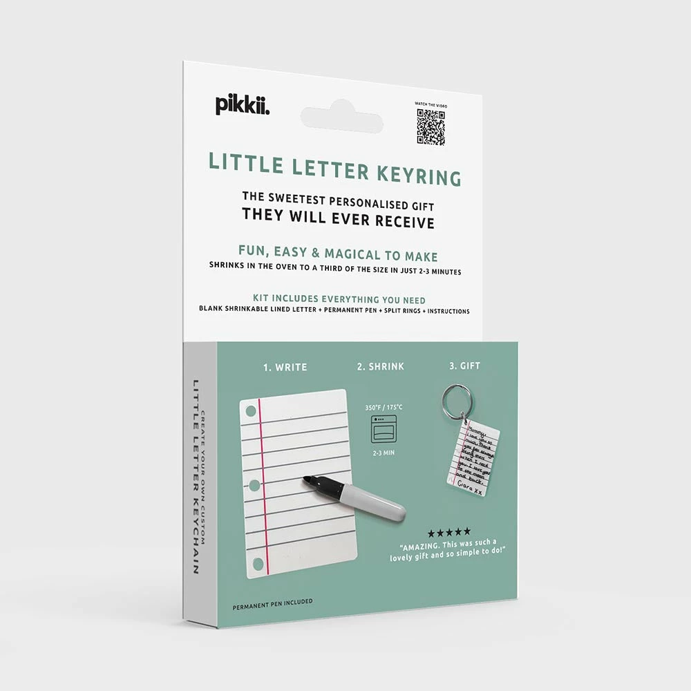 Kit includes: Blank shrinkable lined letter, permanent marker pen, split rings and an instruction sheet.