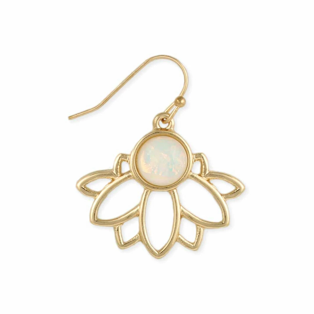 A delicate lotus outline design includes a round iridescent imitation opal stone center. This mystical earring is sure to leave you with a sense of peace!