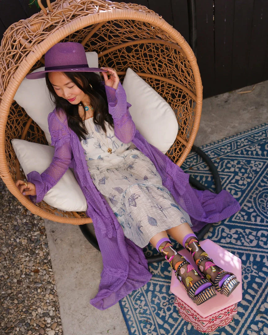 We don’t want to brag, but these are the cutest mushrooms you’ll ever wear on your feet. Channel your inner boho queen and add a dash of whimsy to your look with our Magic Mushrooms Sheer Sock, set against a black sheer fabric for a mysterious vibe.
