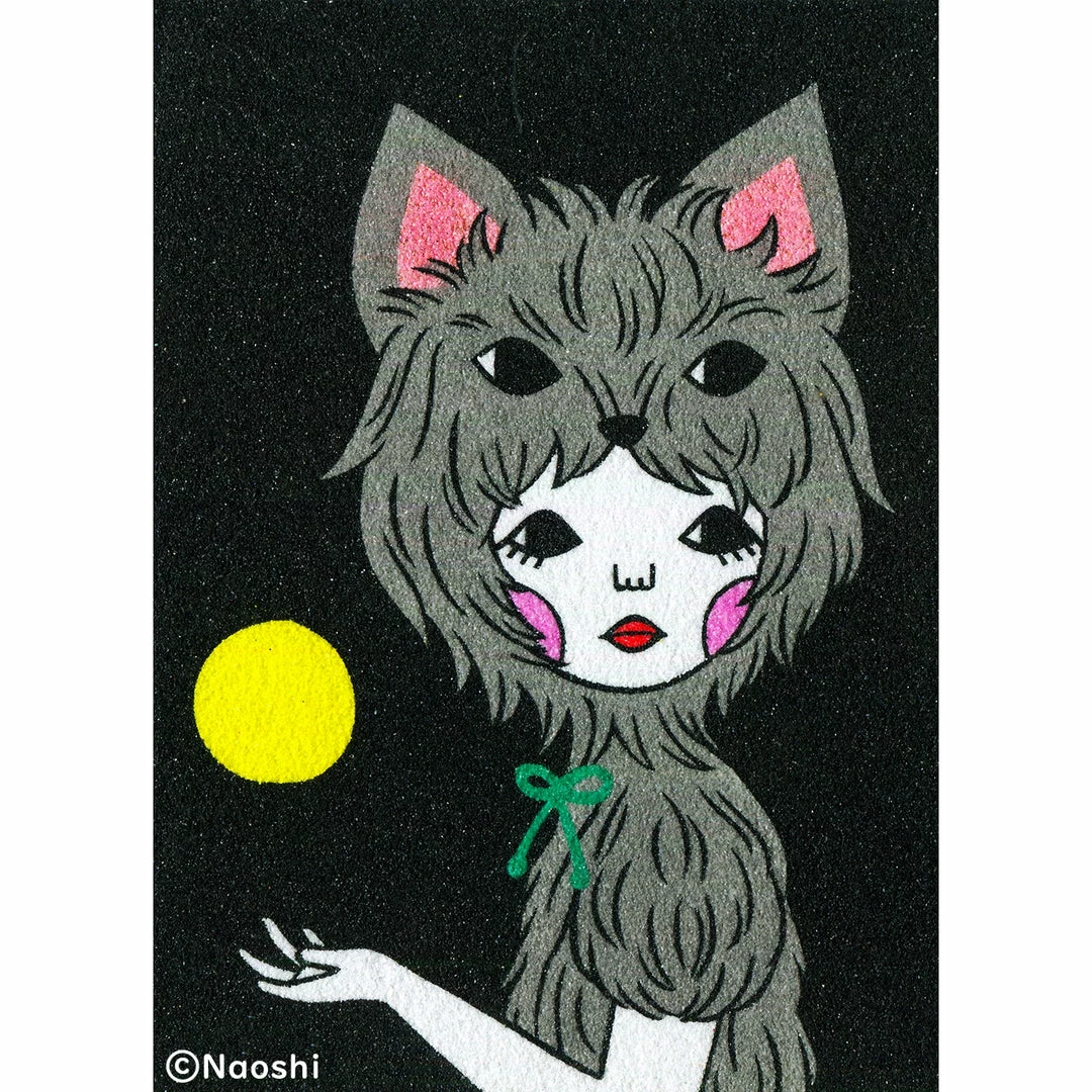 Naoshi was born in Iwate, Japan, and currently lives and works in Los Angeles. She works with the medium of sand art known as Sunae in Japanese. Using brightly colored, shiny grains of sand, she visualizes a fantastical world of her own, imbued with a sense of nostalgia.
