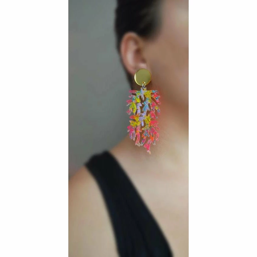 Laser cut acrylic earrings featuring a unique hand painted pattern of hot pink, yellow and lavender with gold and blue glitter. Above are gold mirrored acrylic cut outs.