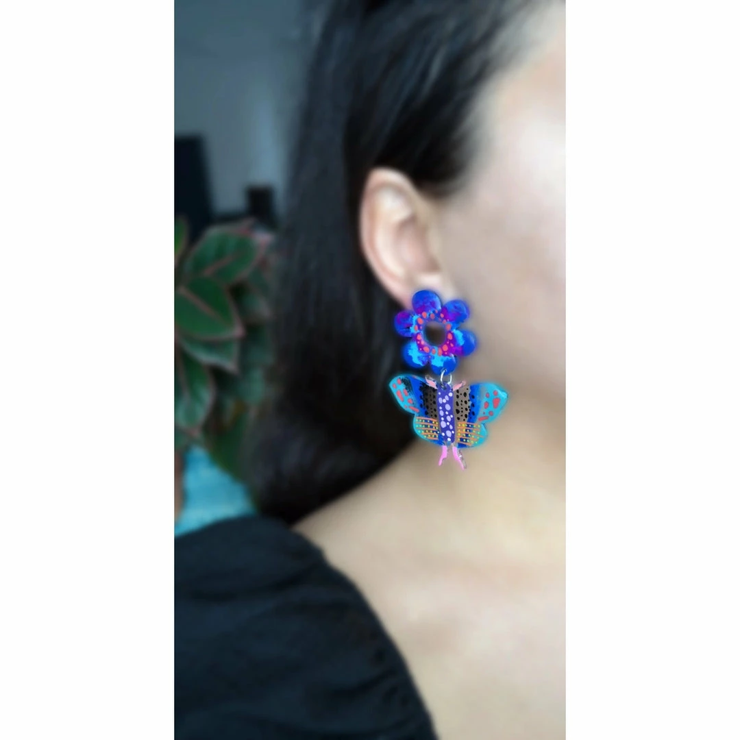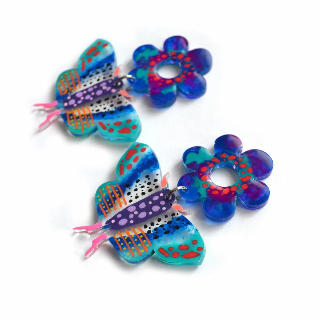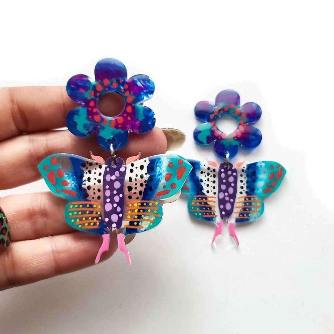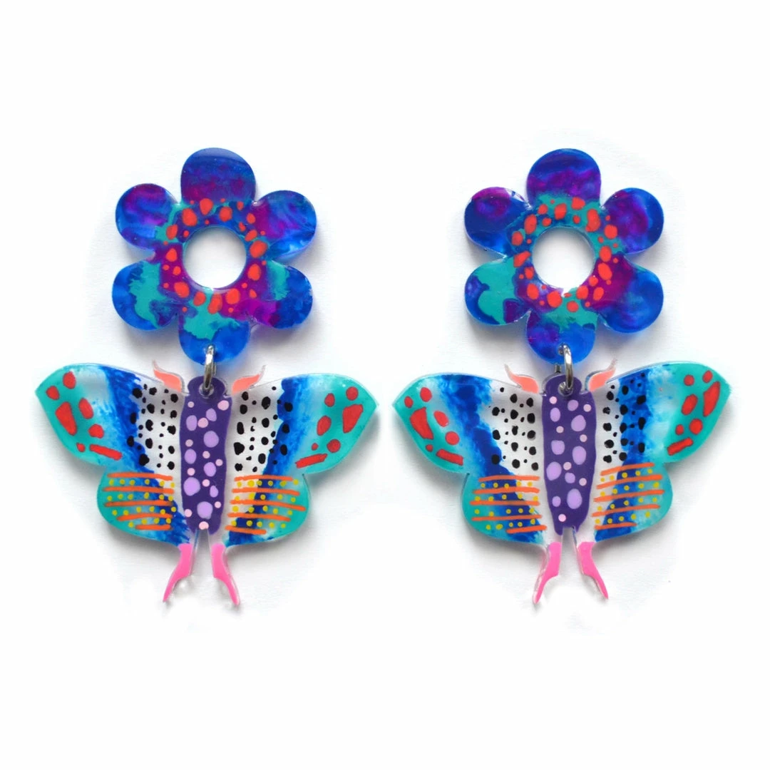 Laser cut butterfly acrylic earrings featuring a unique hand painted pattern of a purple, red and blue watercolor with small painted geometric details. The butterflies hang from turquoise mirrored acrylic circles.