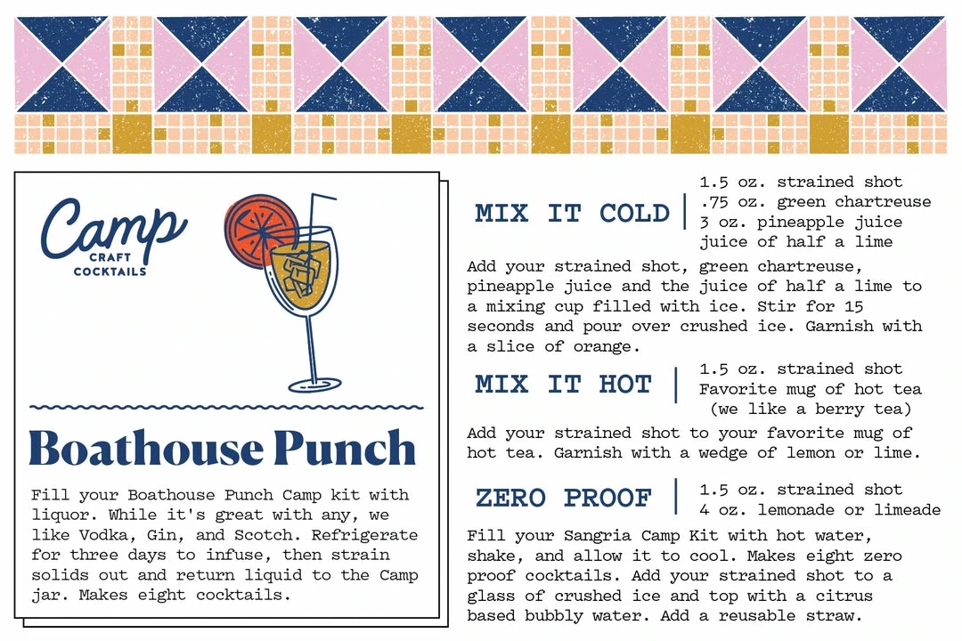 CAMP Craft Cocktails Kit includes: 1 Infusion ready jar. Alcohol not included. Serves 8, can be infused twice for a total of 16 servings.