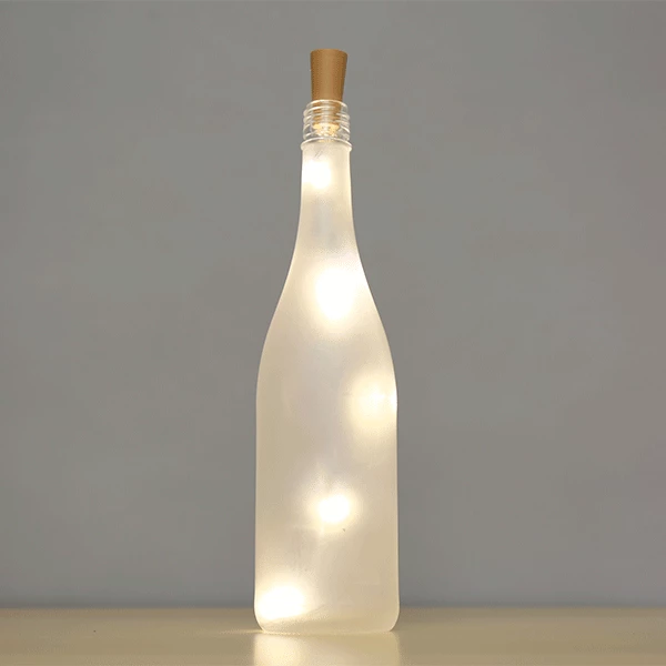 Turn empty bottles into a decorative piece. Fits most bottles. Ideal table centerpieces to create romantic mood lighting. • 5 warm white LED string lights connected to a cork top