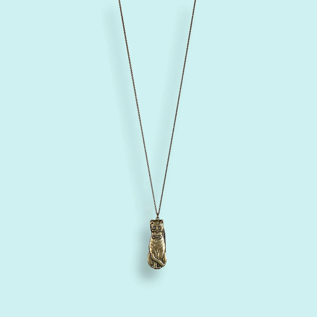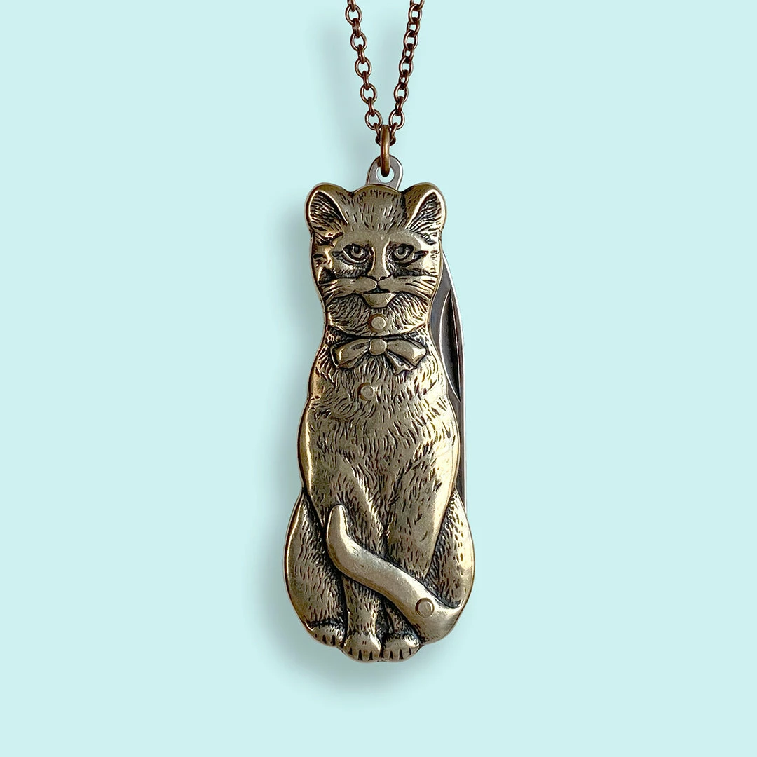 A gold metal folding knife featuring a dapper cat wearing a bow tie on long antiqued brass cable chain. Â