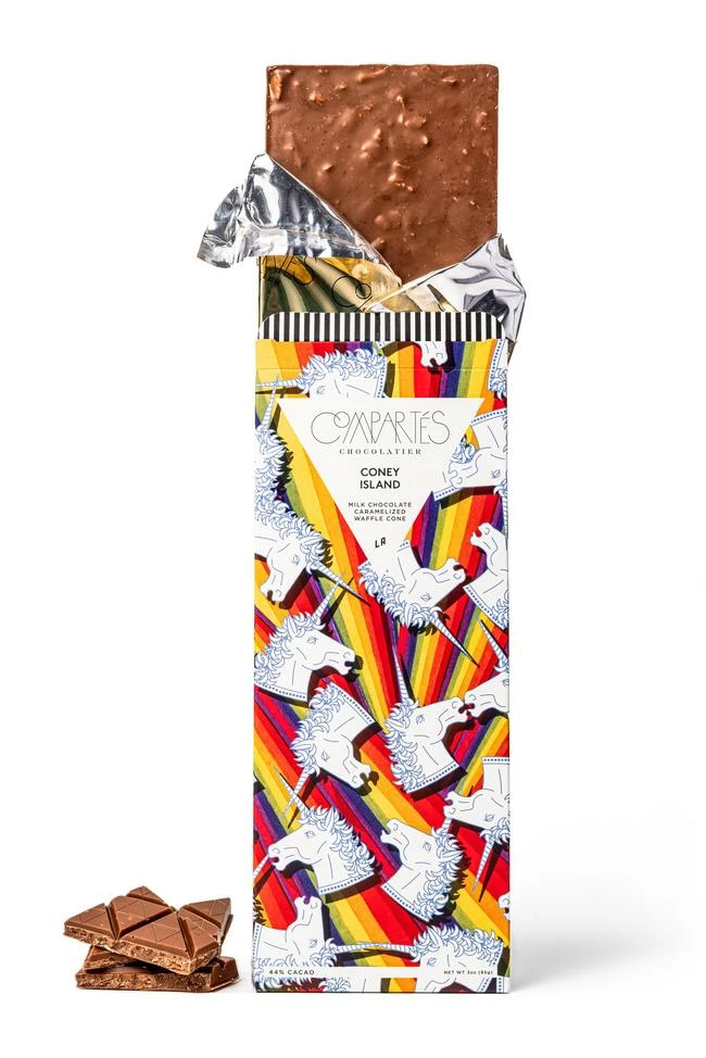 Coney Island-milk chocolate is filled with crispy caramelized waffle cone pieces. This Coney Island chocolate bar is a nostalgic treat like no other. Compartés’ signature creamy milk chocolate is packed full of caramelized crunchy waffle cone pieces. One bite into this creation and you will feel like you are right on the boardwalk of Coney Island enjoying a fresh ice cream waffle cone! Handmade in Los Angeles.