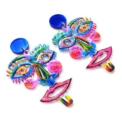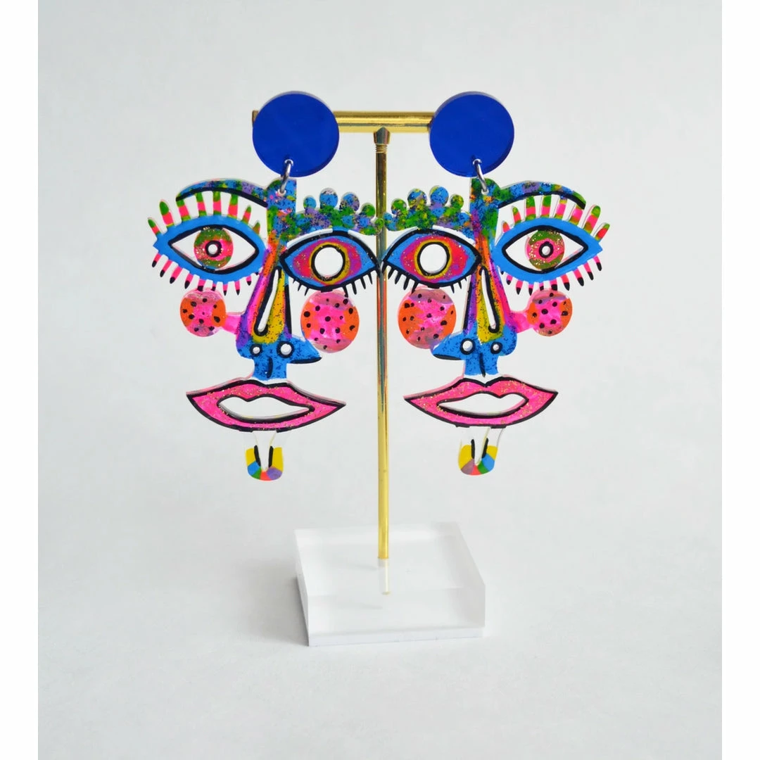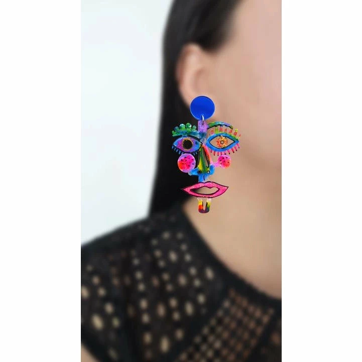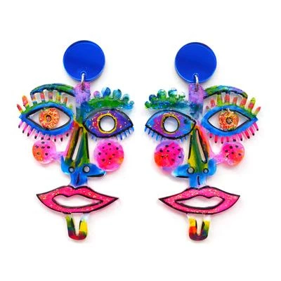 Laser cut abstract face acrylic earrings featuring unique hand painted pink, black, blue, yellow green and purple resin with dark blue and gold glitter. Above are electric blue mirrored acrylic cut outs. – Painted pattern is over clear, see through, acrylic. This effect gives the earrings a fun layered depth.