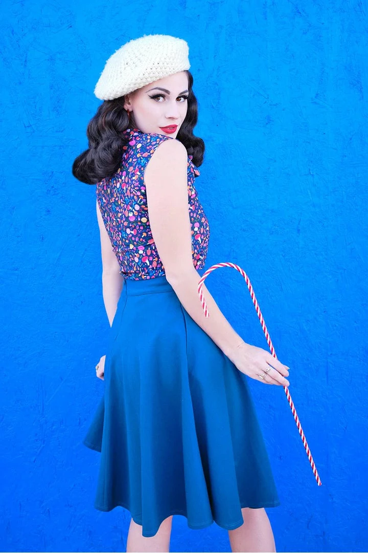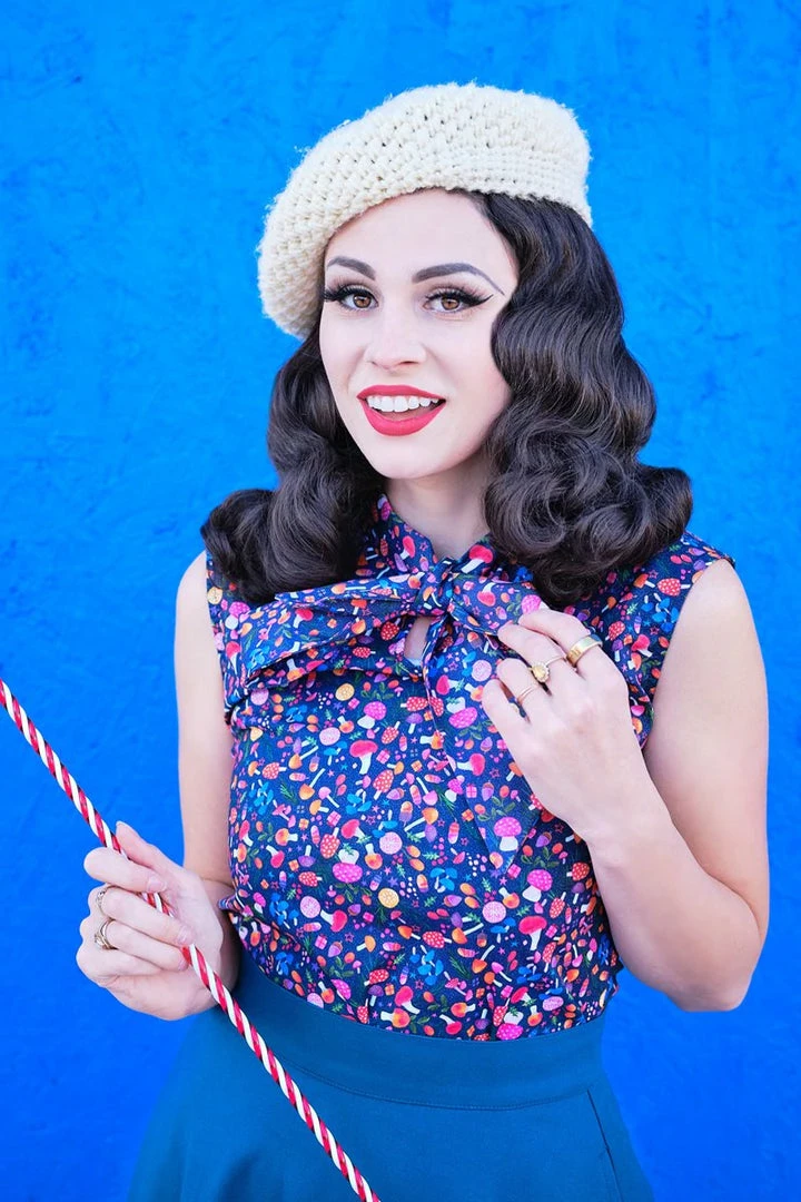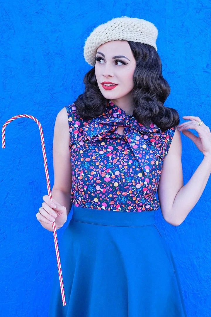 This top is for the vintage lover at heart! Shown in our whimsical Festive Fungi print, this 100% cotton top features bust darts for a flattering silhouette, a side zippered closure for ease of wear, and an oversized bow at the neckline for that perfect 1950’s inspired look.