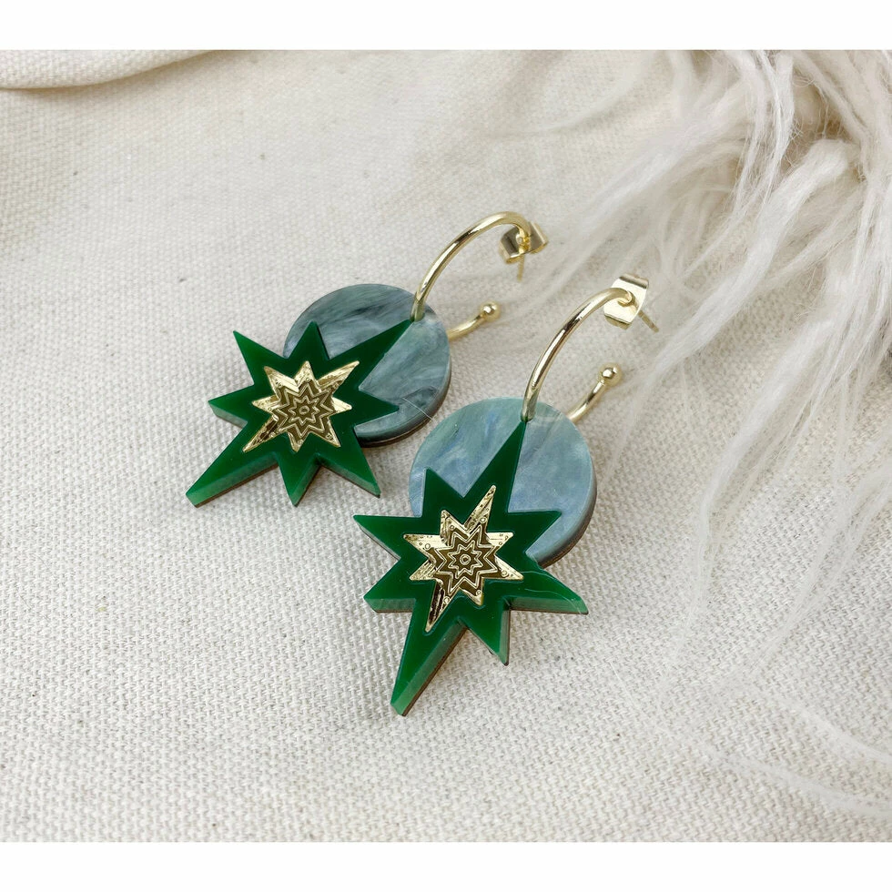 2 tone greenย deco star hoop earring with gold mirrored center๐