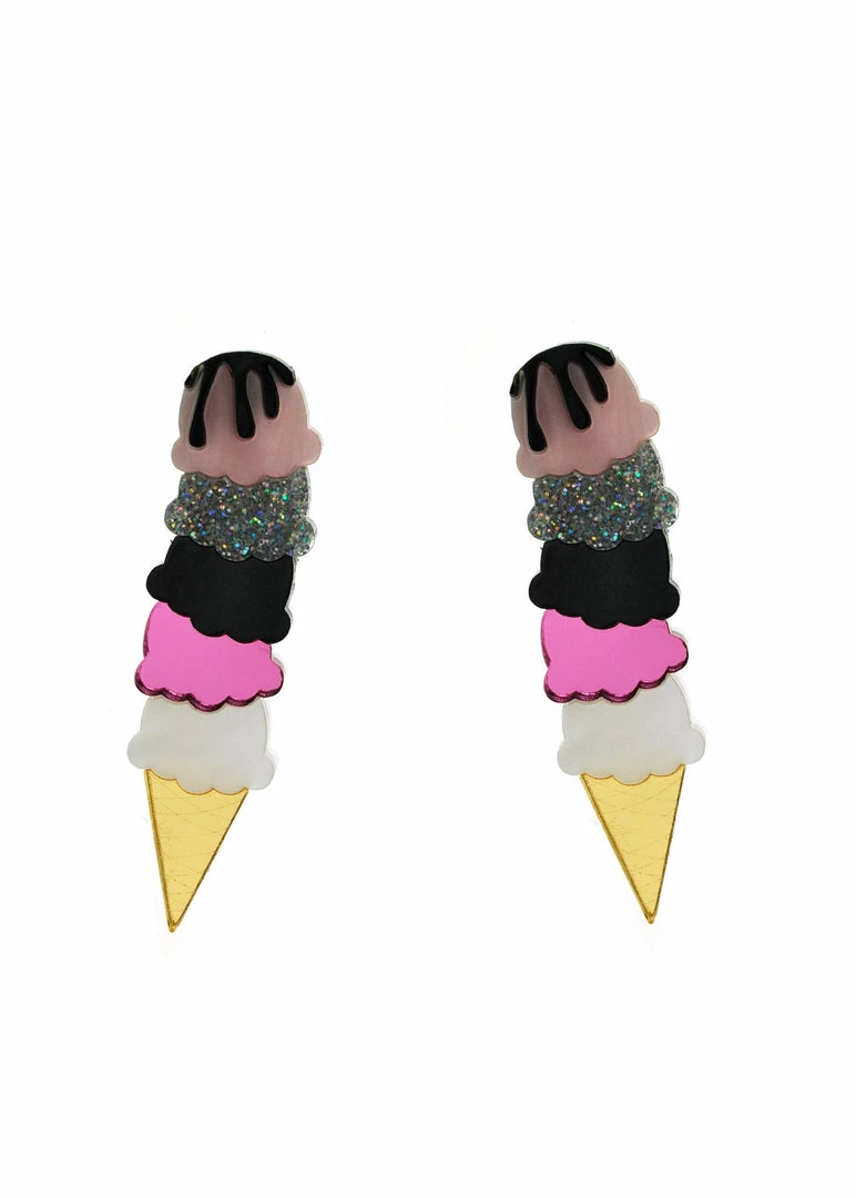 Here’s the scoop on these ice cream earrings; our Extra-Large Ice Cream Cone earrings feature shiny and sparkly multi-colored acrylic (plastic) cut and assembled in our studio in Austin, TX. Each pair of Extra-Large Ice Cream Cone earrings is secured to a surgical steel post. Our Ice Cream Cone earrings feel surprisingly lightweight on your earlobes.Â