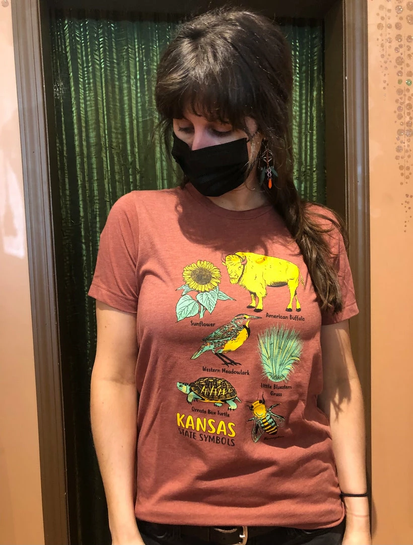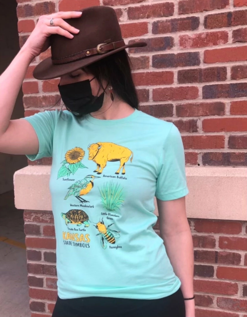 Soft, high quality unisex tee featuring a smattering of Kansas state symbols.