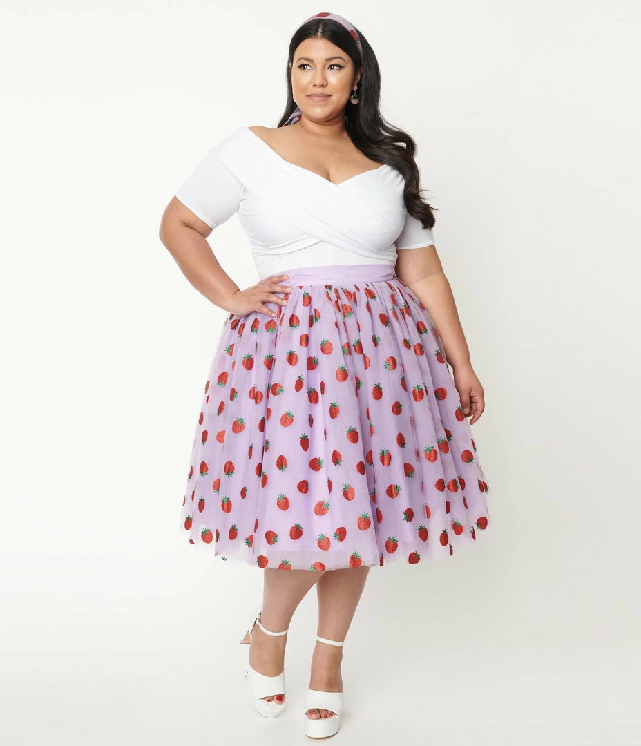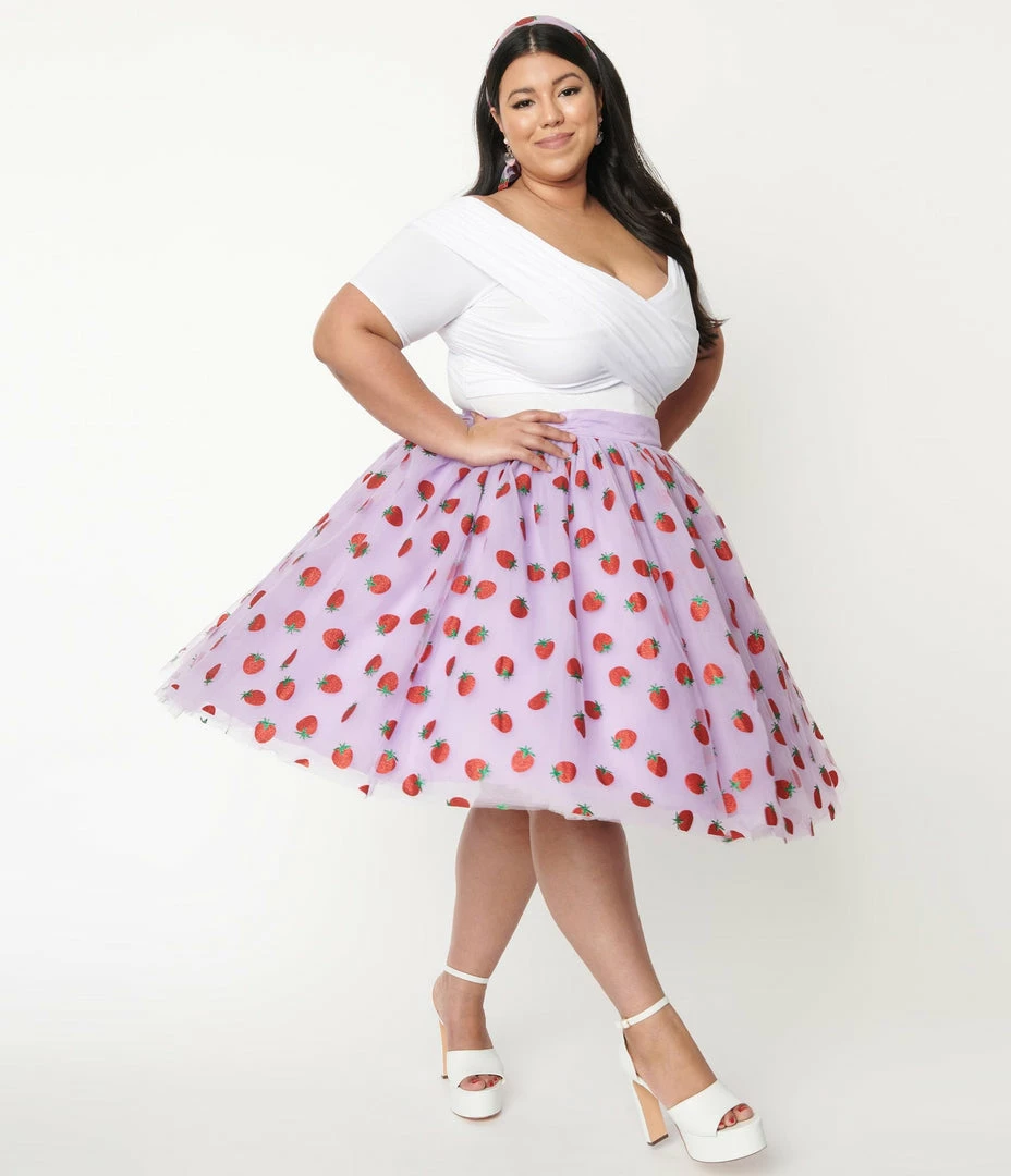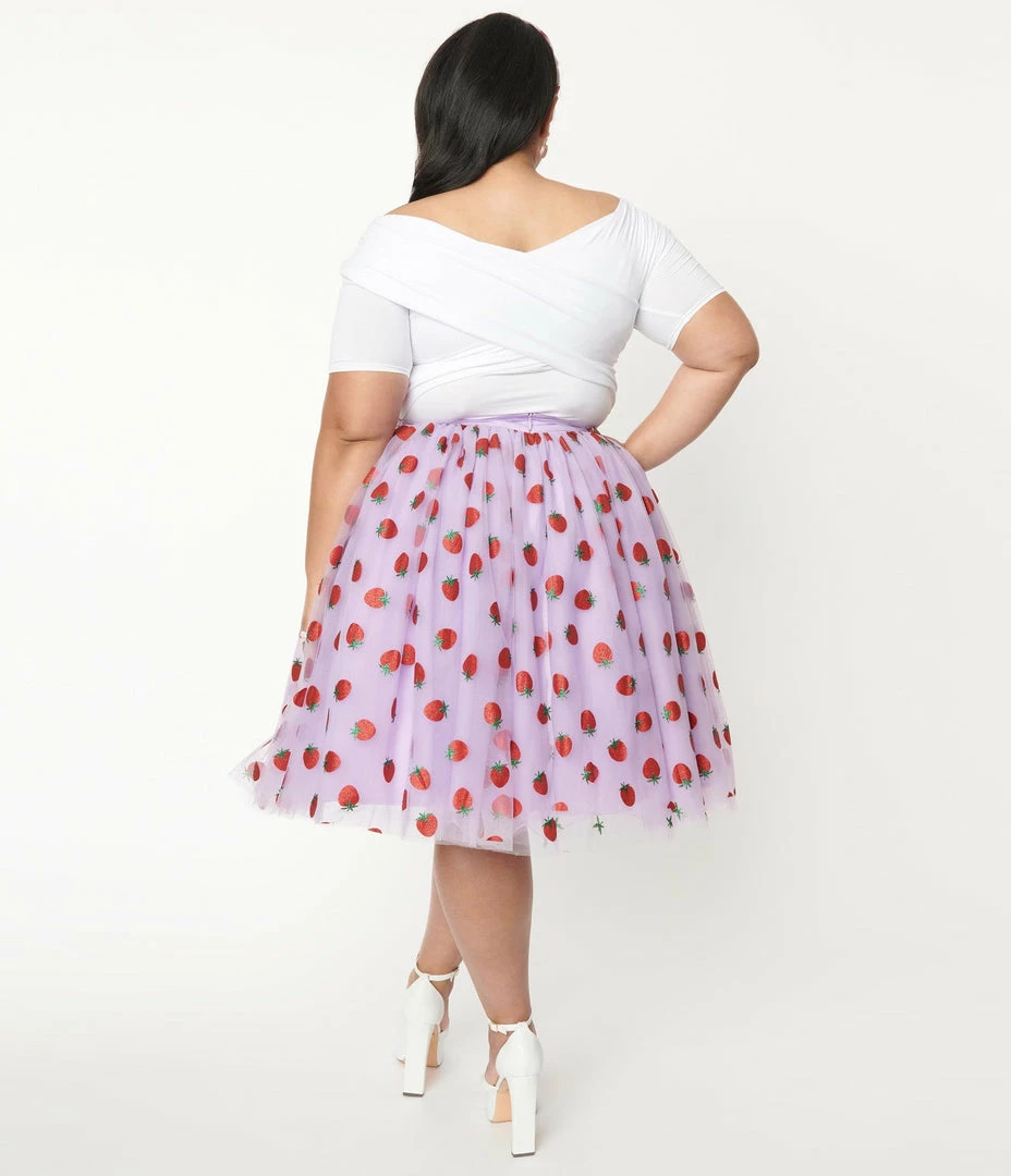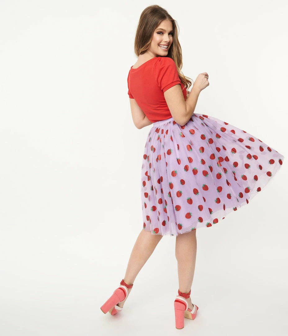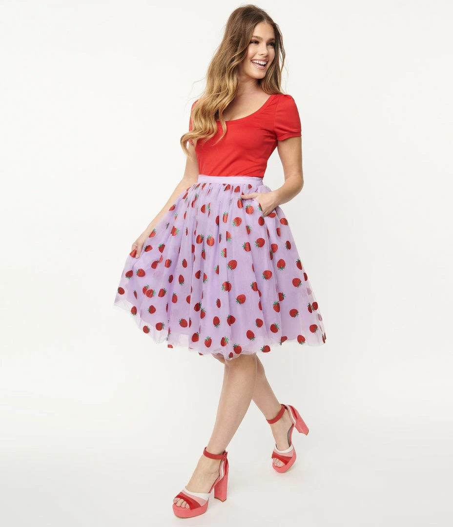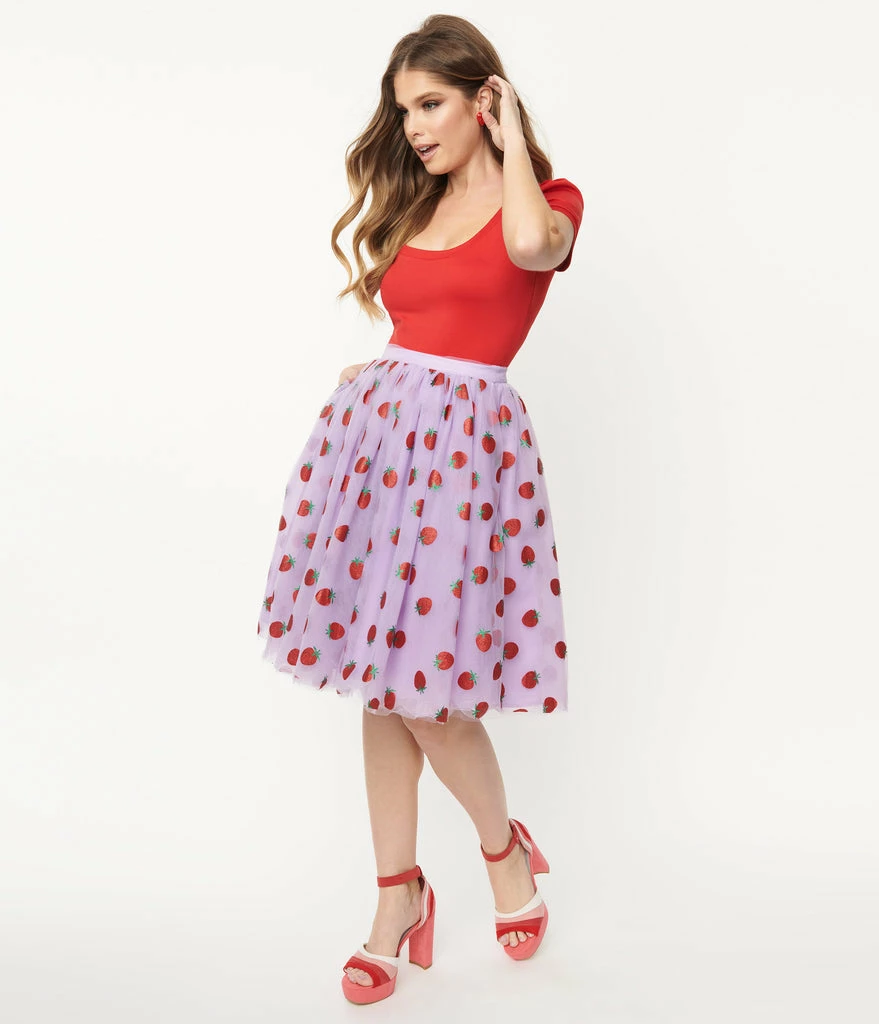 Grab a slice or two, dames! This delectable separate from Unique Vintage dances with red glitter printed strawberries throughout the lavender mesh. The Sweetie Pie Skirt features a high banded waist, cinched with a back zipper while layers of mesh and lavender tulle cascade over black lining and drop to your knees, complete with hidden side pockets for modern function!