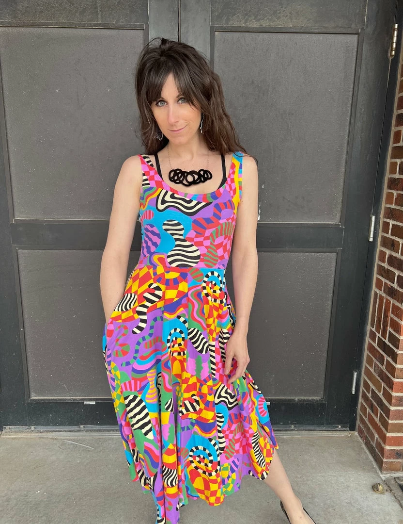 Made in stretch cotton jersey this is the perfect summer fit and flare to wear EVERYWHERE! The fitted tank bodice is extremely flattering and the full skirt is long enough to twirl at any party. And of course hidden pockets!