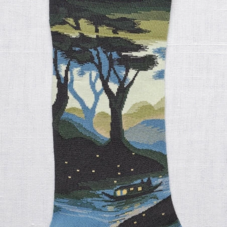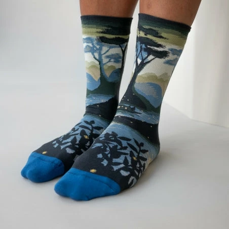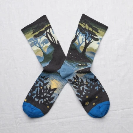 Mimosa Yellow, Moss Green, Spruce Green and Night Blue Fireflies on Paradise Blue background with Cobalt Blue toe.
