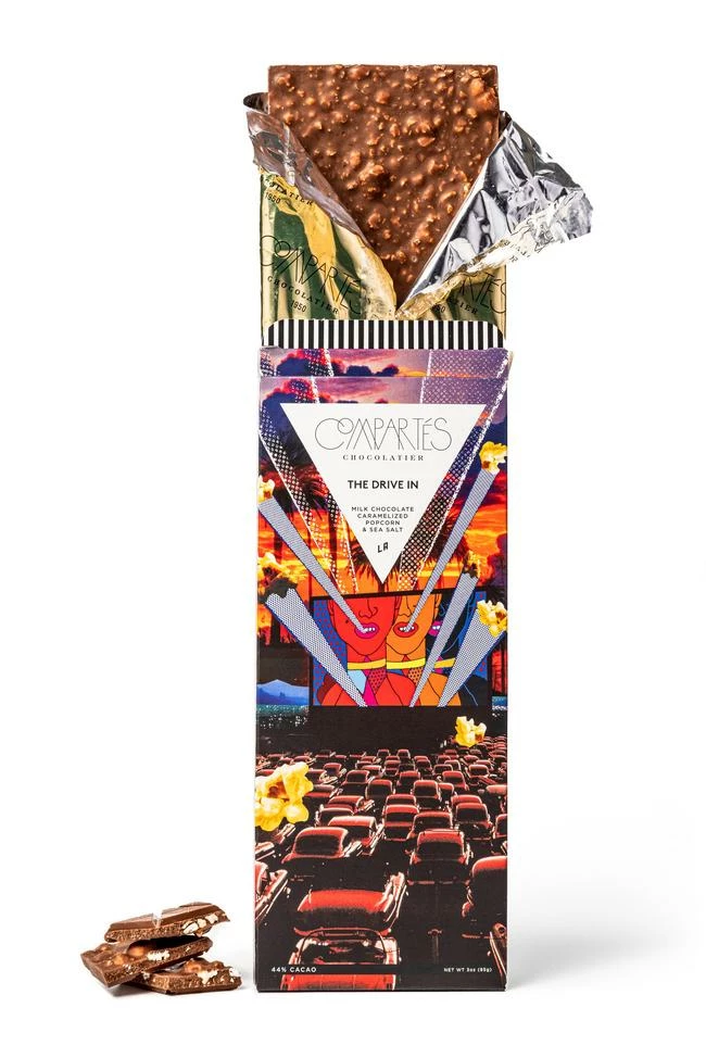 Compartés gourmet milk chocolate and popcorn Drive In bar takes you to the movie theatre with just one bite. Made with traditional candy corn, kettle corn and caramelized movie popcorn all crunched up and drenched in their signature milk chocolate. If you go to the movie theatre and mix your chocolate with your popcorn, this chocolate bar is for you! Features a drive-in movie theatre mixed with Los Angeles Hollywood iconic on the packaging. Handmade in Los Angeles.
