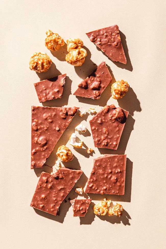 Ingredients: Milk Chocolate (Cocoa Mass, Milk, Sugar, Cocoa Butter, Soy Lecithin as an Emulsifier, Vanilla), Popcorn (Corn, Sunflower Oil, Cane Sugar, Sea Salt, Molasses, Butter)
