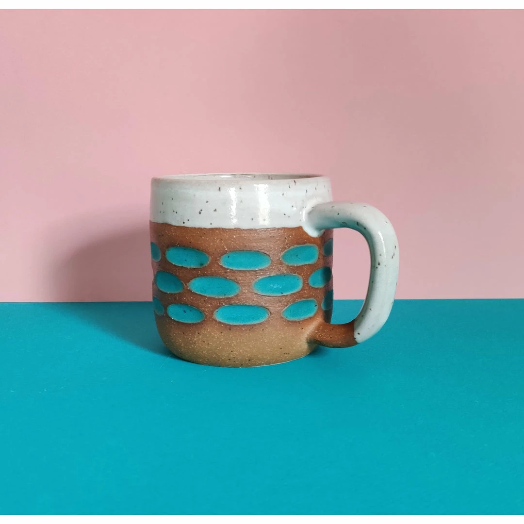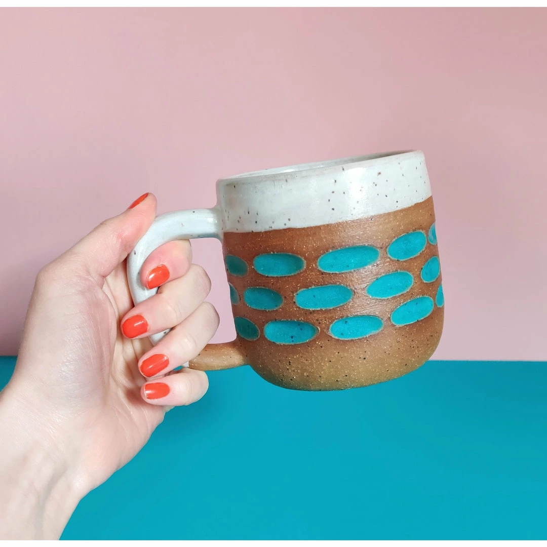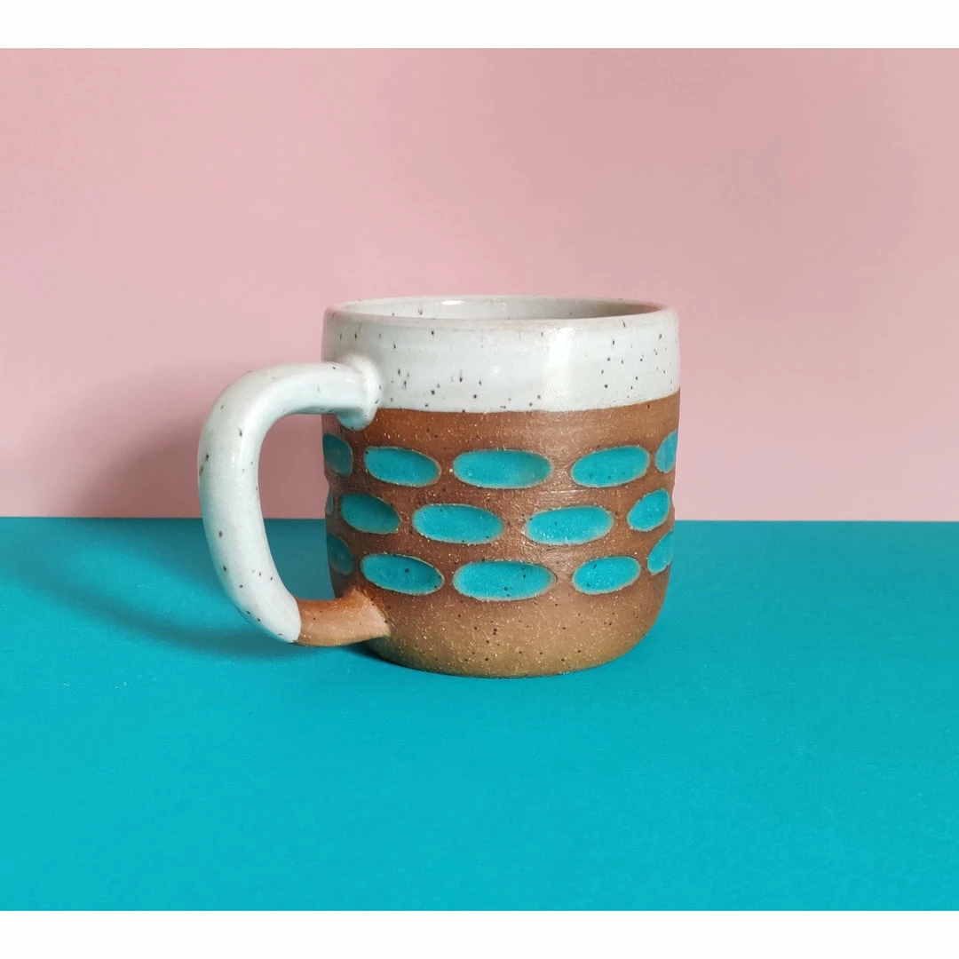 This ceramic mug is thrown on the wheel and then hand carved. The interior, top, and handle are glazed a glossy white that shows the speckles through the clay. The carved portions are glazed a brilliant matte turquoise. The rest of the mug is the natural stoneware clay. 16 oz