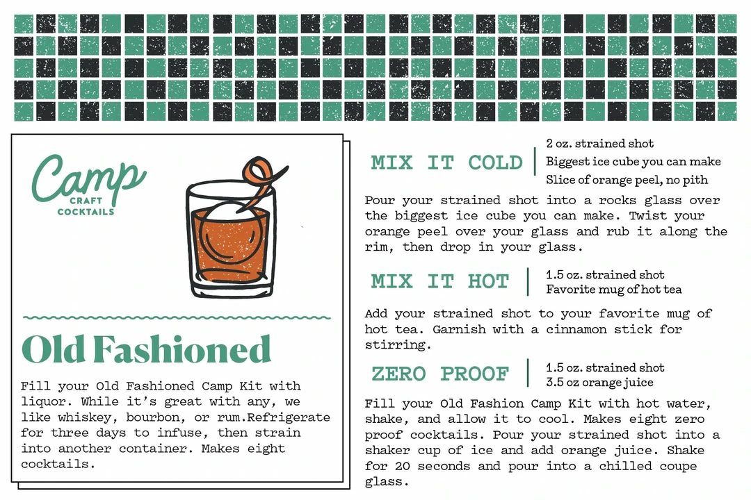 CAMP Craft Cocktails Kit includes: 1 Infusion ready jar. Alcohol not included.ย Serves 8, can be infused twice for a total of 16 servings.