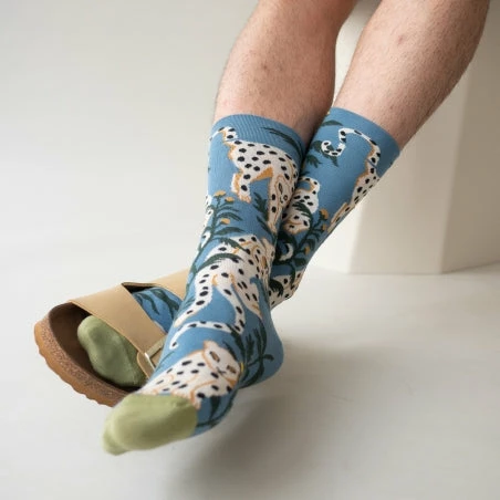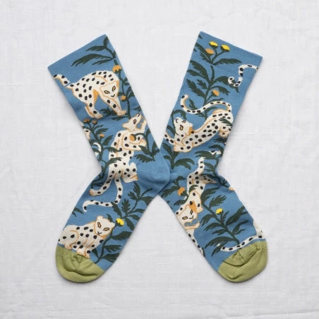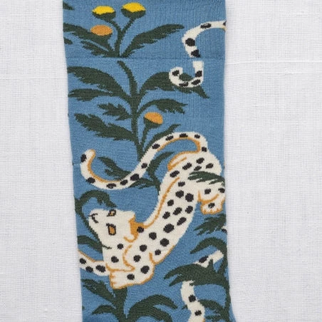 Natural, Night Blue, Ochre Brown and Spruce Green Panther on Paradise Blue background with Moss Green toe.