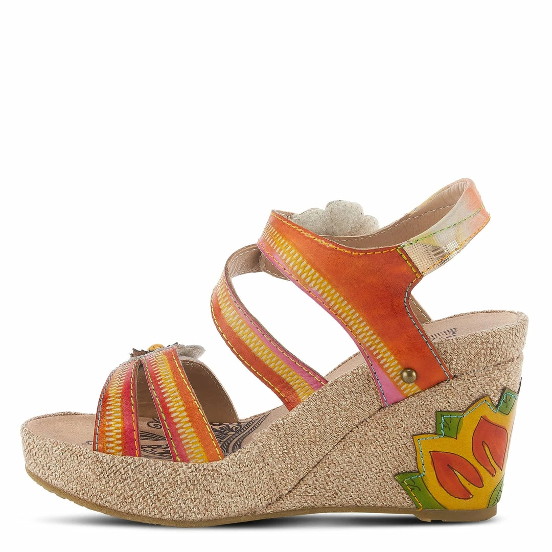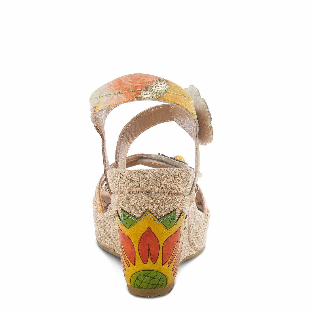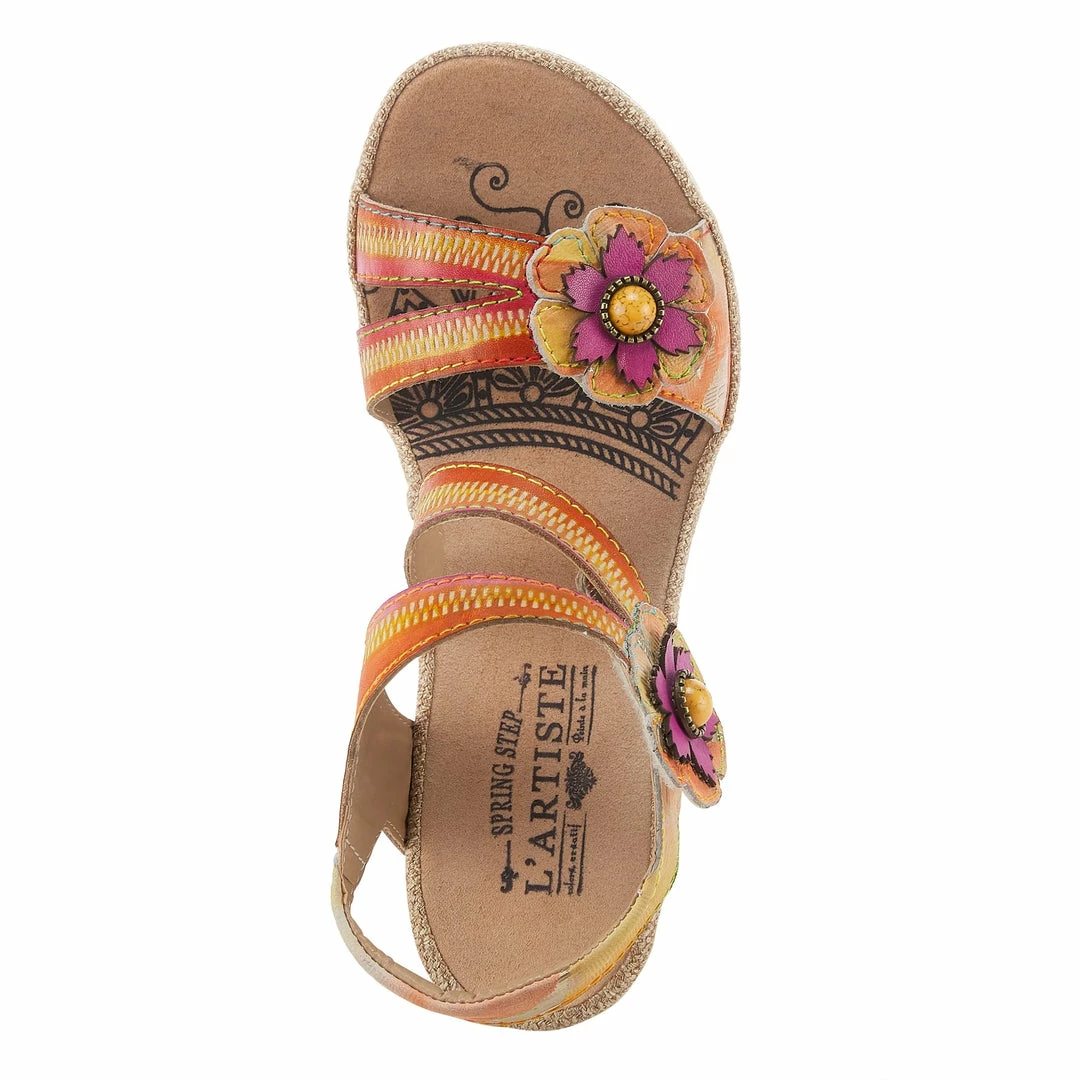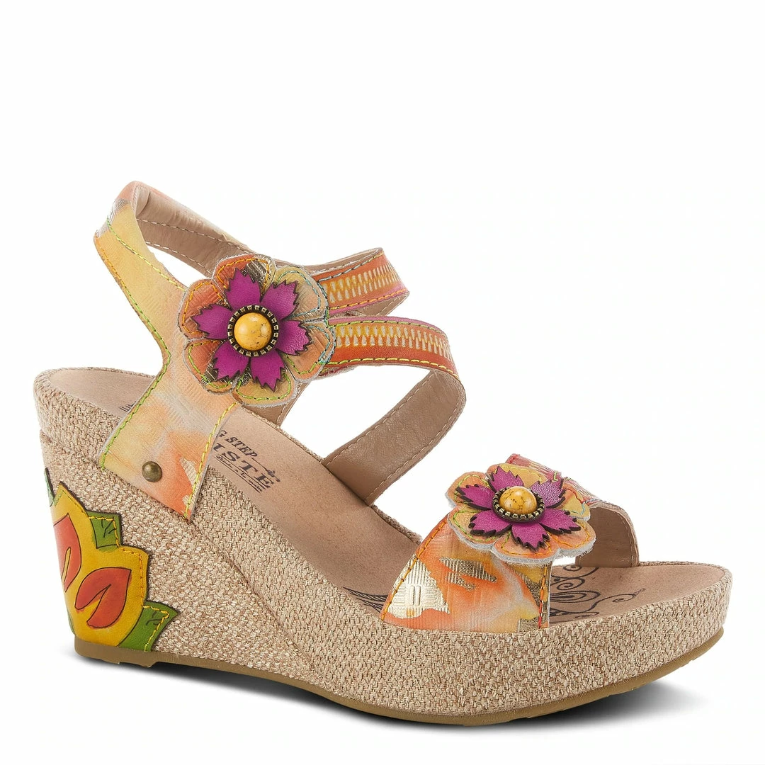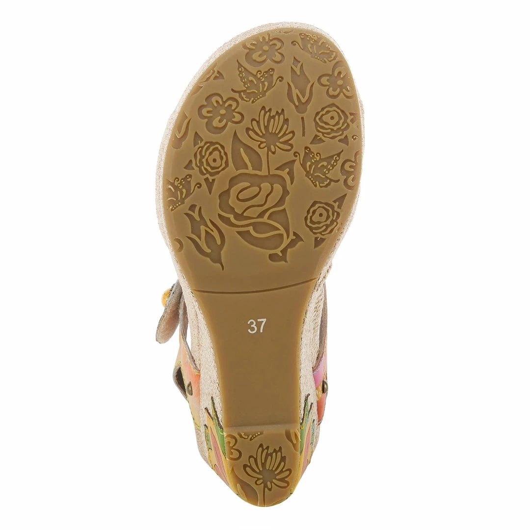 Canvas wrapped wedge quarter strap sandal featuring embossed leather upper with a zipper design, two adjustable hook and loop straps styled with decorative flowers and a lotus flower applique on the heel.