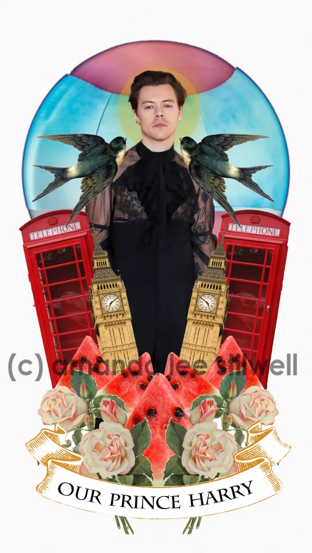 8″ Tall white altar/ prayer candle featuring a digital collage of Harry Styles along with London phone booth, Big Ben, swallows, watermelon, vintage Victorian roses and a banner that reads “Our Prince Harry”