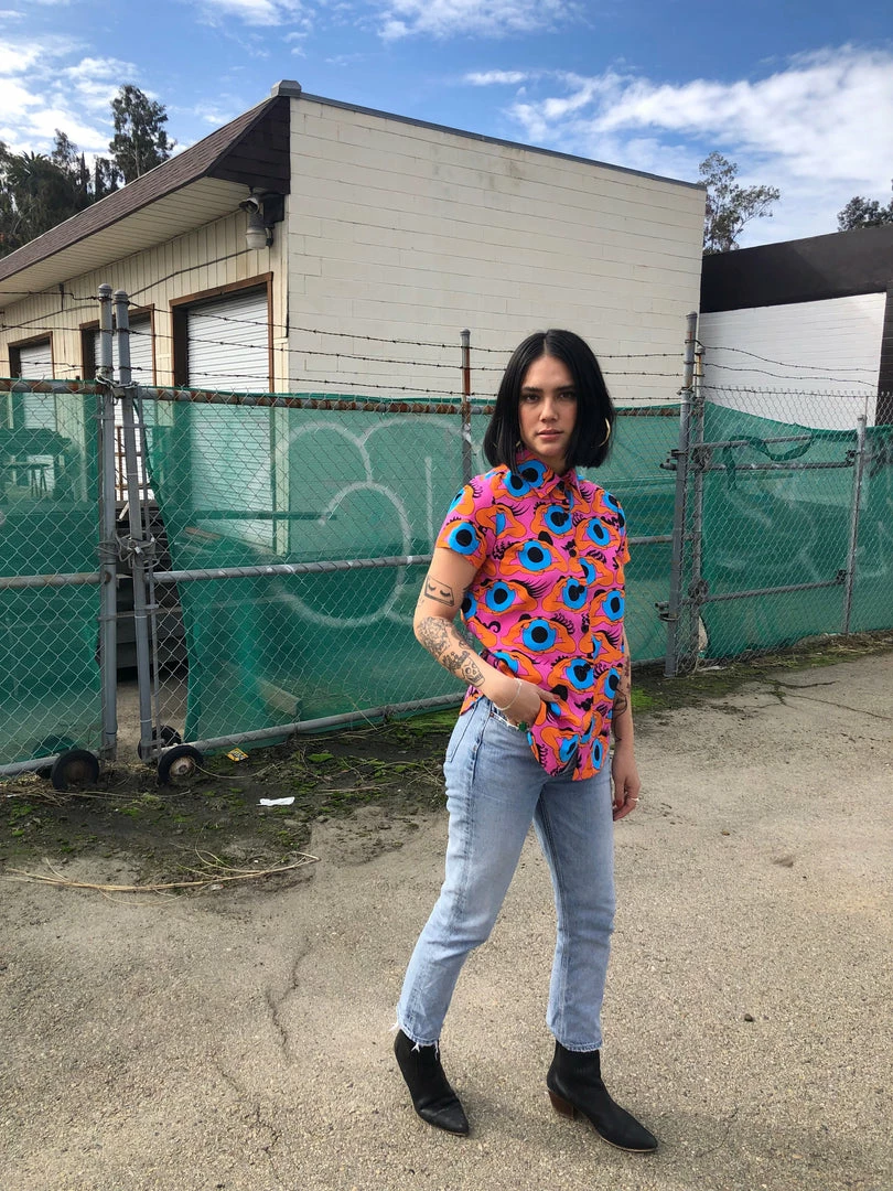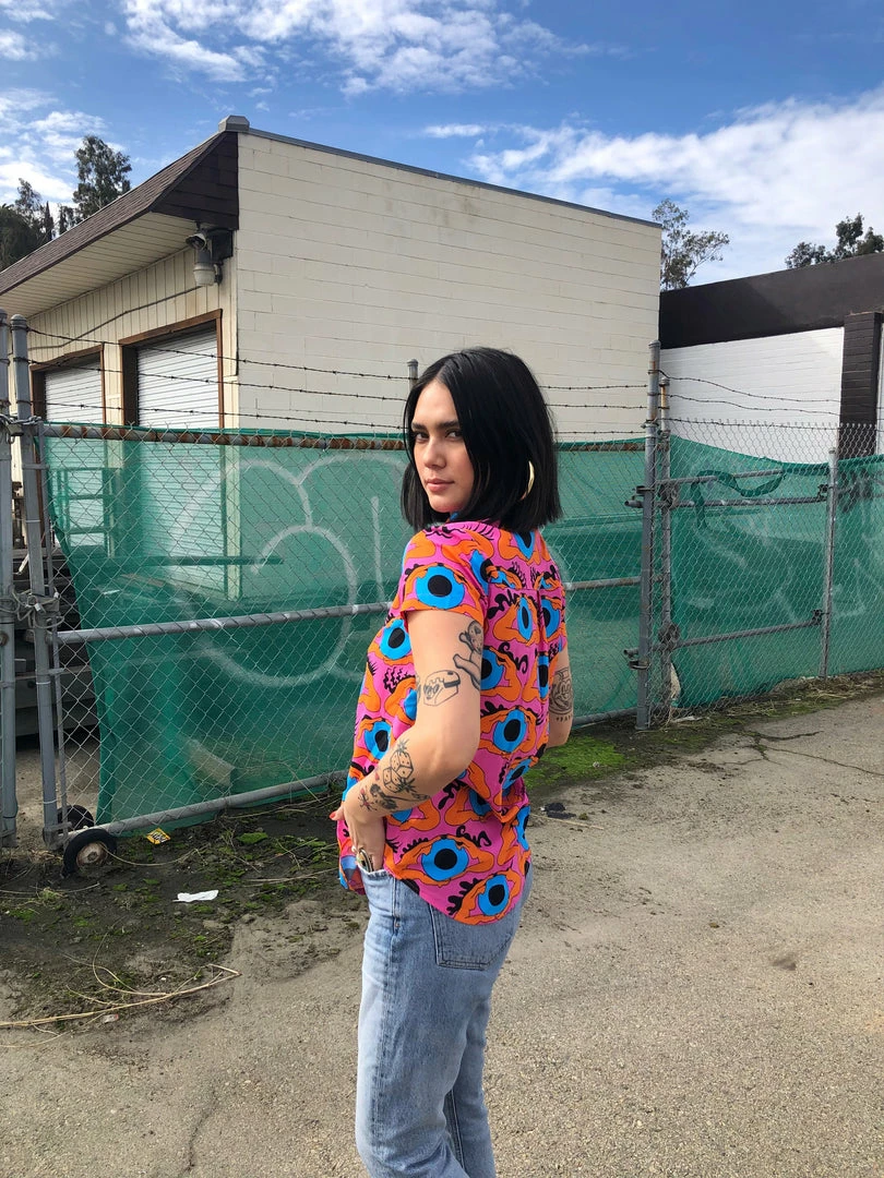 Made in 100% rayon, featuring artwork by Lydia Ortiz