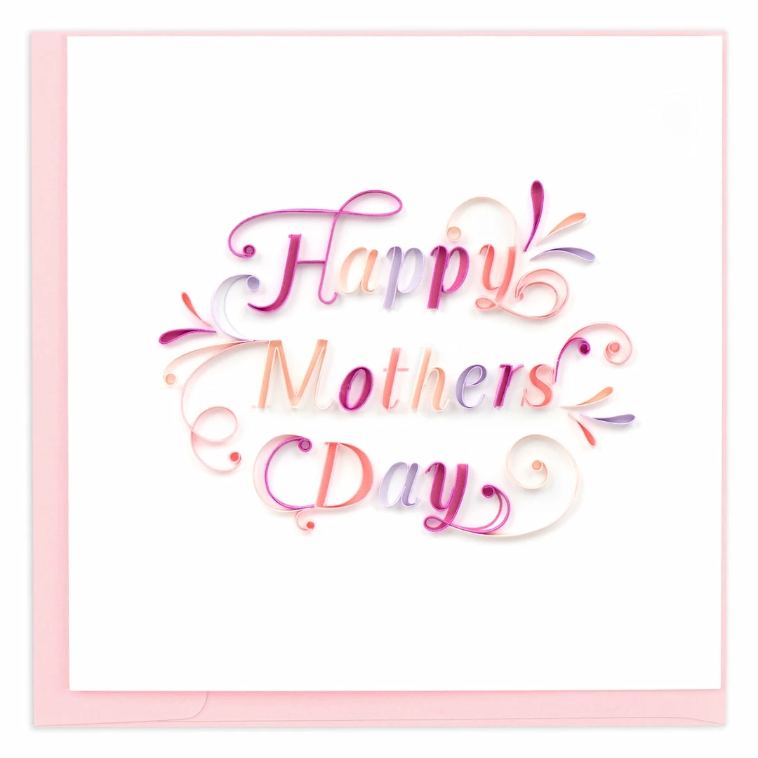 One of the best Mother’s Day gifts is letting mom know just how much she means to you. The Quilled Happy Mother’s Day card is the perfect way to let her know how you feel. The words “Happy Mother’s Day” quilled in purples, red, and orange with stylized swirls adorn the front of this card.