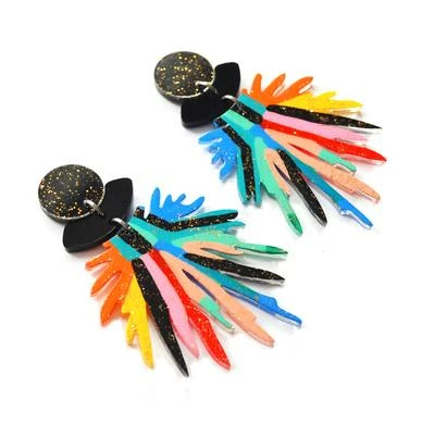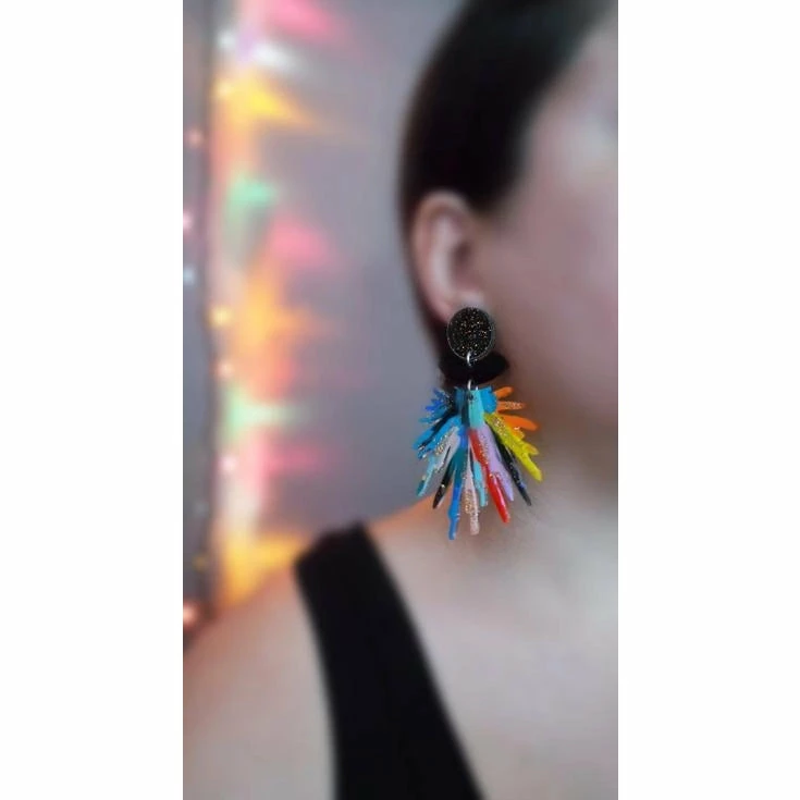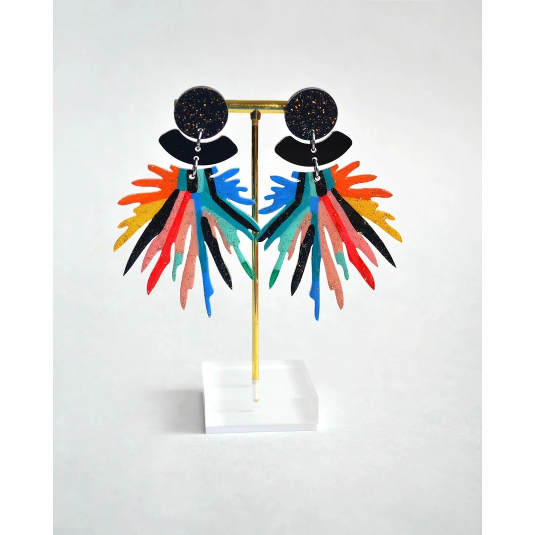 Laser cut acrylic earrings featuring a unique hand painted pattern of red, yellow, orange, lavender, peach and turquoise, dark blue and black with gold glitter. Above are black and gold glitter acrylic and black acrylic cut outs.