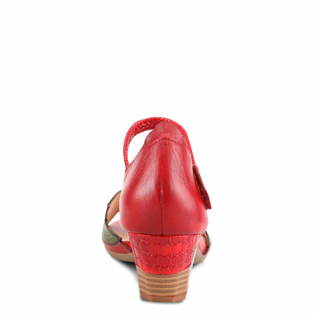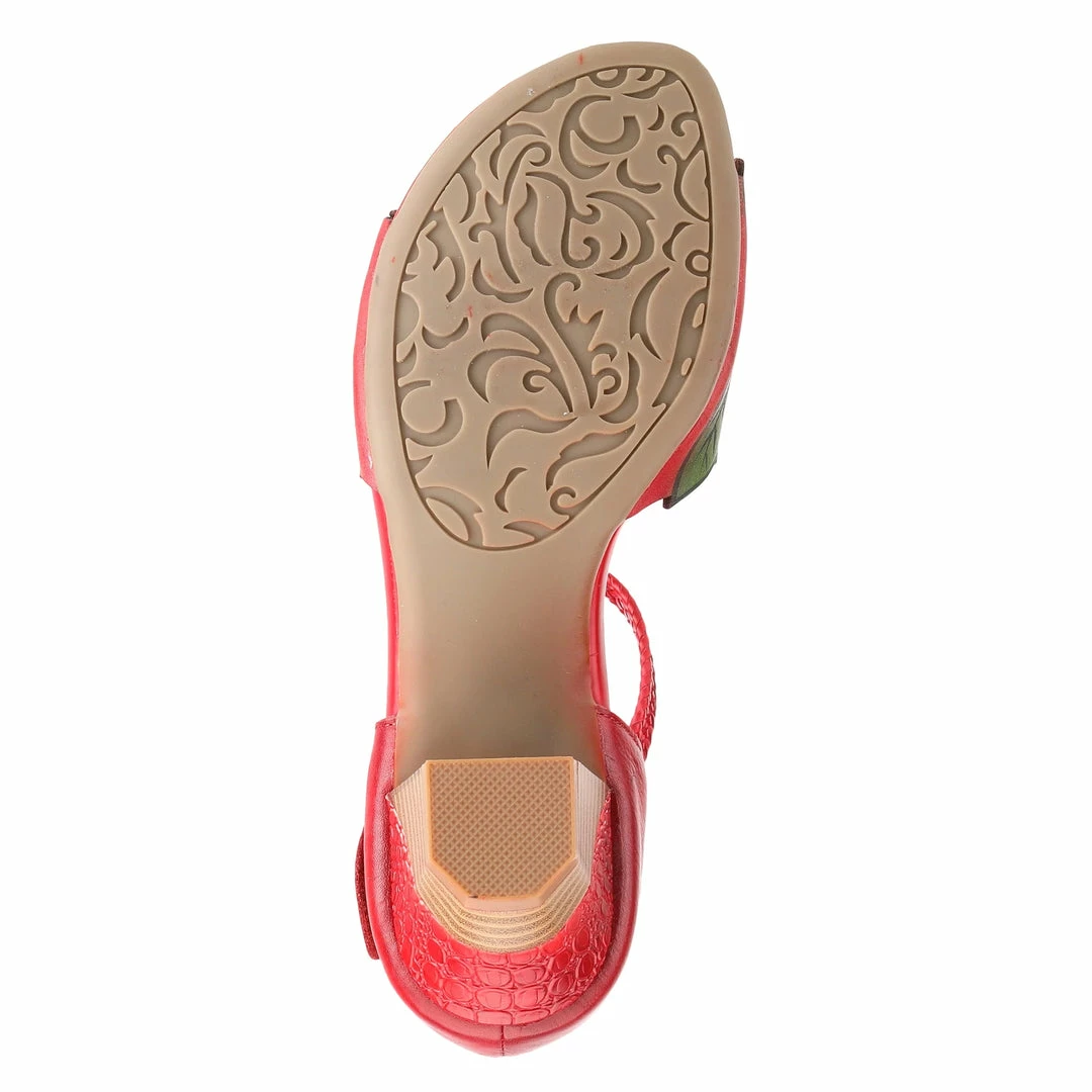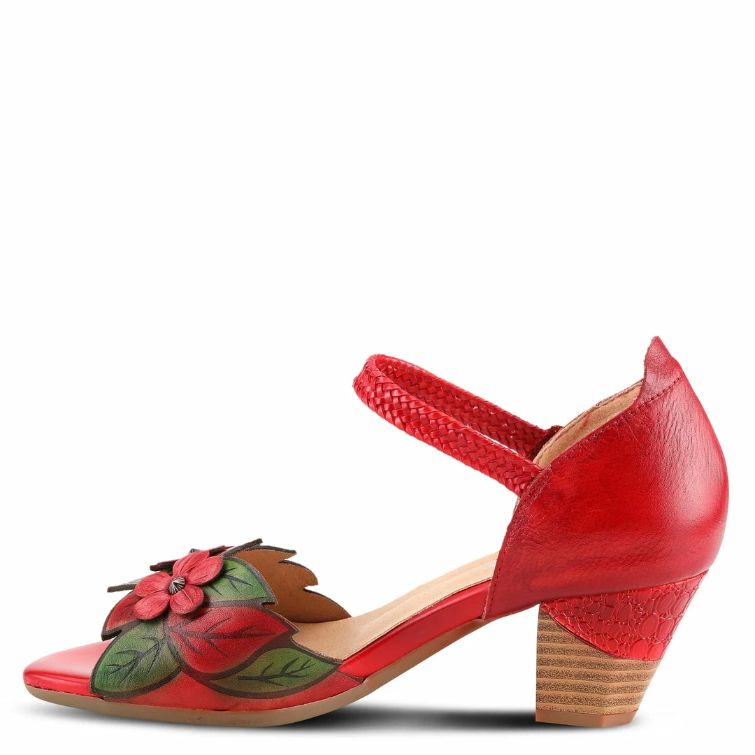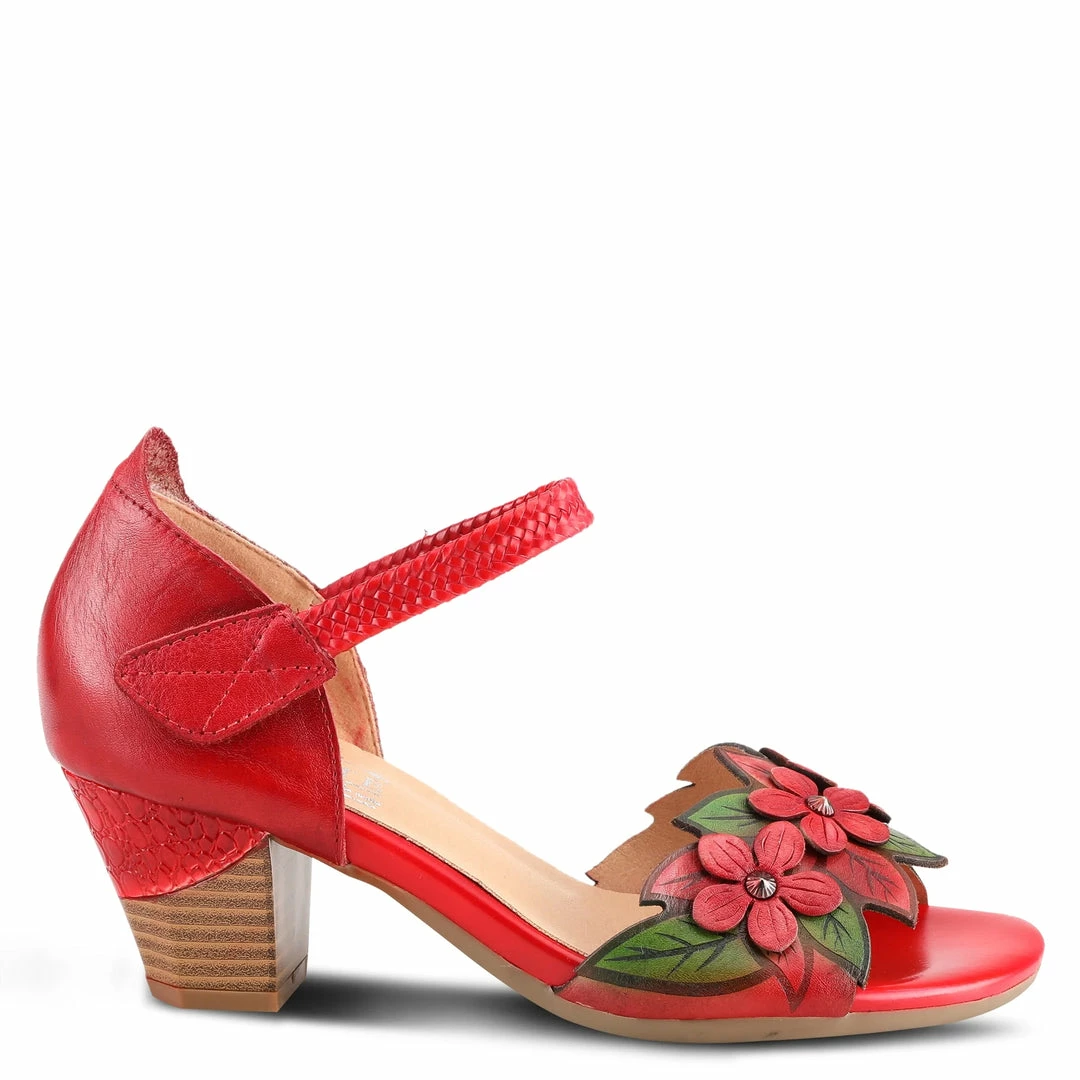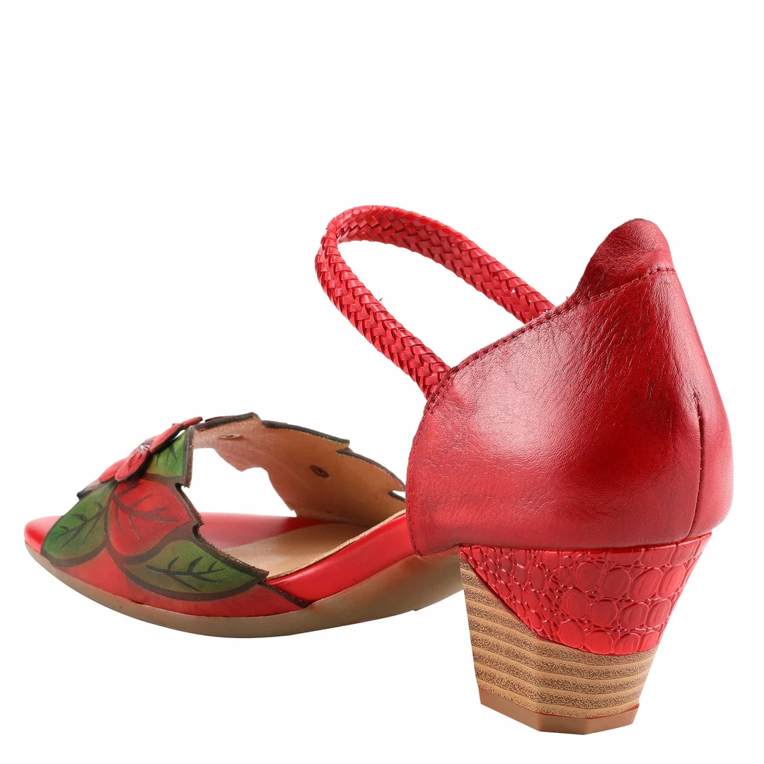 Maryjane style closed back sandal with braided hook and loop ankle strap on a pentagon shaped croco printed inlay and stacked look heel, featuring a trio of 2-tone blossoms and etched leaves with center etched antique pyramid spots.