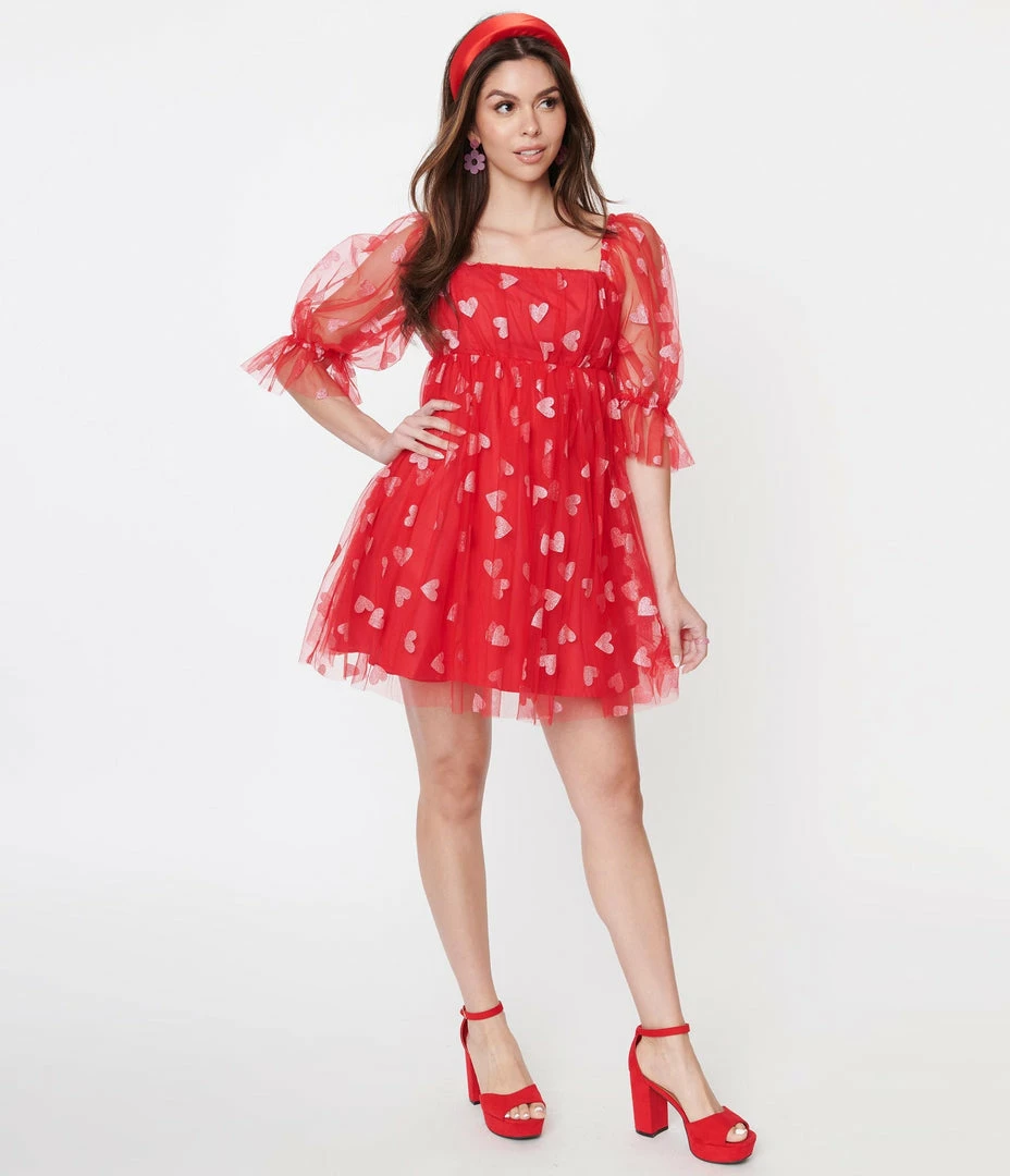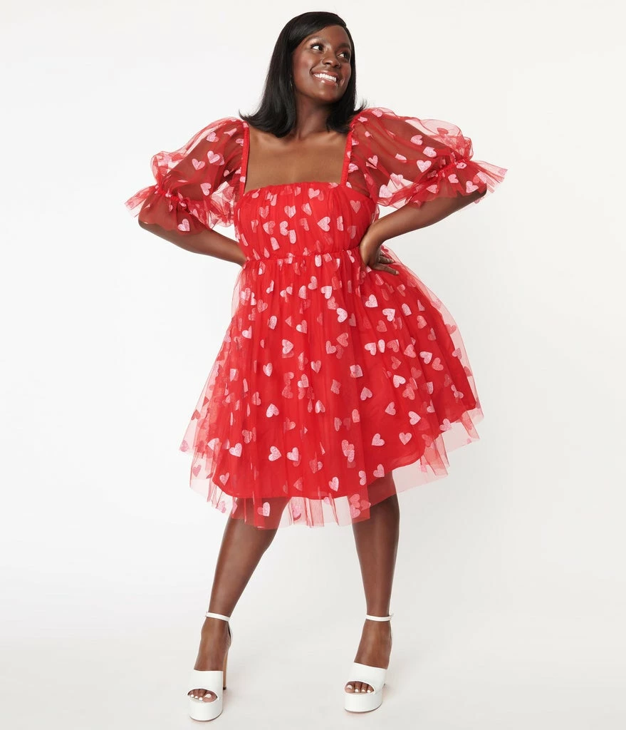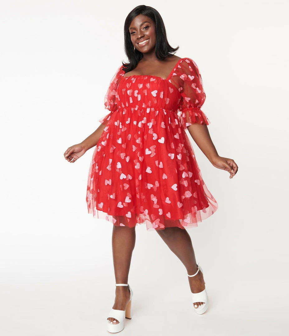You’re the first and last thing on their minds, gals! Play with their hearts in the plus size Love Interest Dress, a fresh babydoll from Smak Parlour. Crafted in red mesh and sparkling with pink glitter hearts printed throughout, the high empire waist is cinched with a back zipper while the square neckline is framed by puffy half sleeves, structured with elastic cuffs and shoulders for versatile wear. The flirtatious flare skirt boasts a dash of tulle of the sultry flounce while red lining keeps you comfortable!