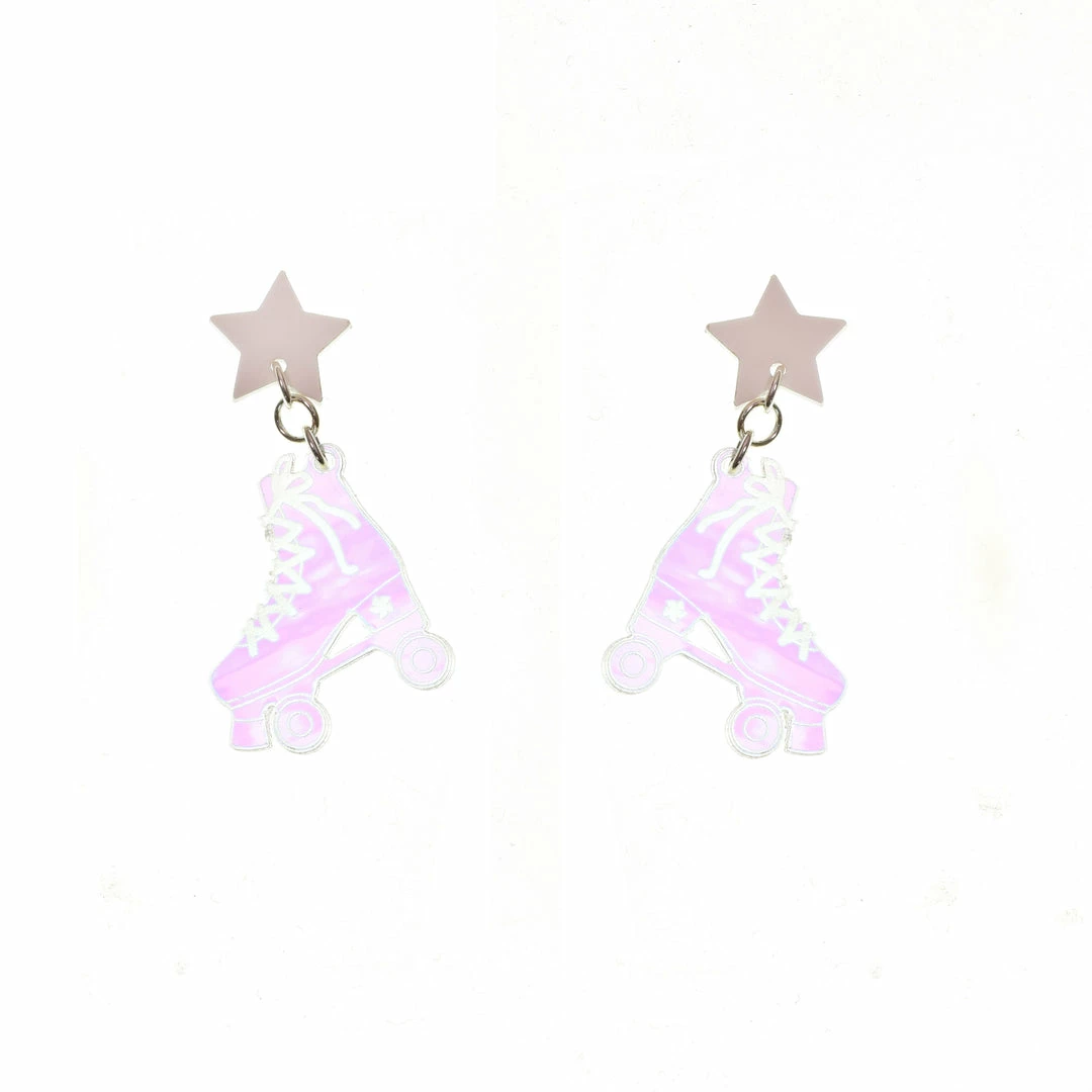 Earrings come as a pair, one left earring, one right earring. Just like a pair of skates. Super shimmery transparent iridescent (hologram) acrylic or plastic and solid white acrylic are used to compose this totally rad set of roller skating-inspired earrings. We use hypoallergenic surgical steel posts to complete this earring. Roll on!
